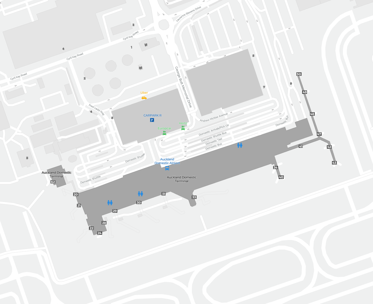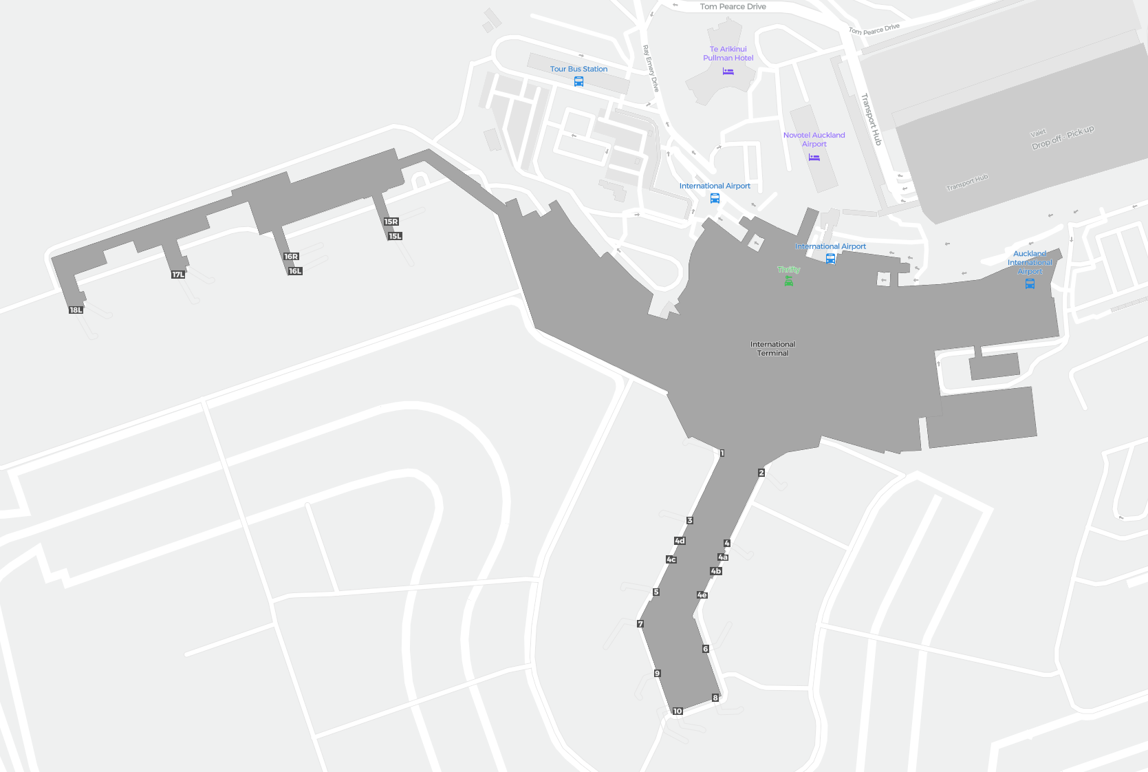 To jest powiększalna mapa nad Auckland (AKL). Mapa pozwala zobaczyć teren z terminalami, parkingami, a na niektórych lotniskach także szczegóły dotyczące bramek, wypożyczalni samochodów i innych udogodnień przy powiększeniu.
