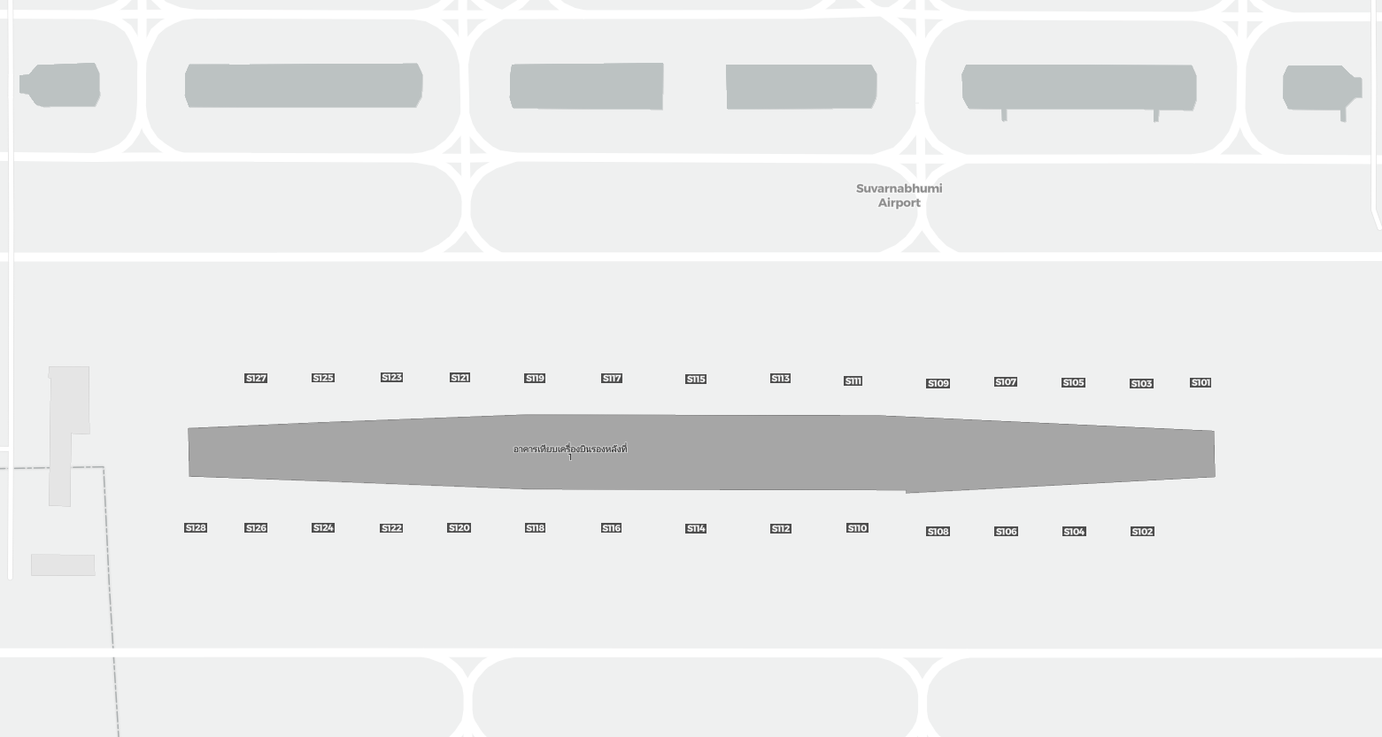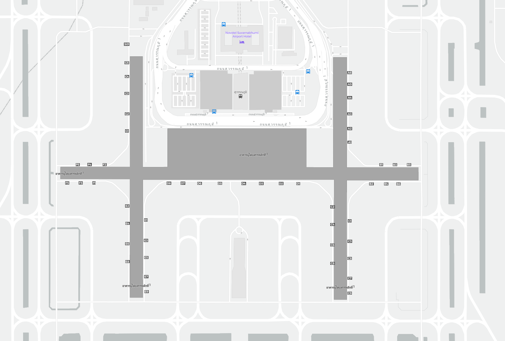 To jest powiększalna mapa nad Bangkok (BKK). Mapa pozwala zobaczyć teren z terminalami, parkingami, a na niektórych lotniskach także szczegóły dotyczące bramek, wypożyczalni samochodów i innych udogodnień przy powiększeniu.