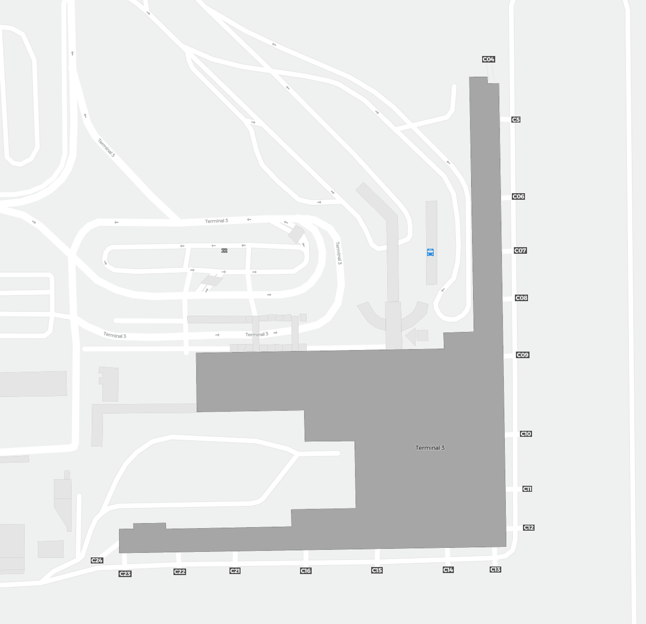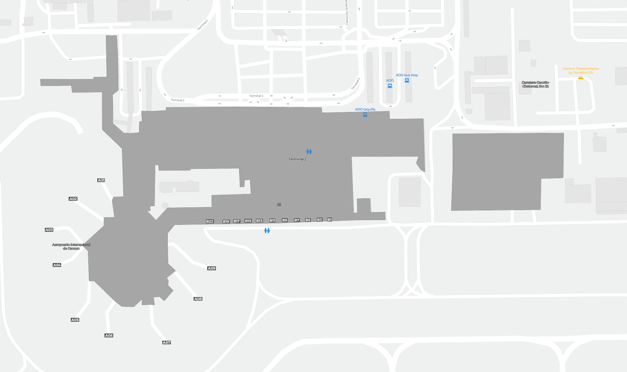 To jest powiększalna mapa nad Cancún (CUN). Mapa pozwala zobaczyć teren z terminalami, parkingami, a na niektórych lotniskach także szczegóły dotyczące bramek, wypożyczalni samochodów i innych udogodnień przy powiększeniu.