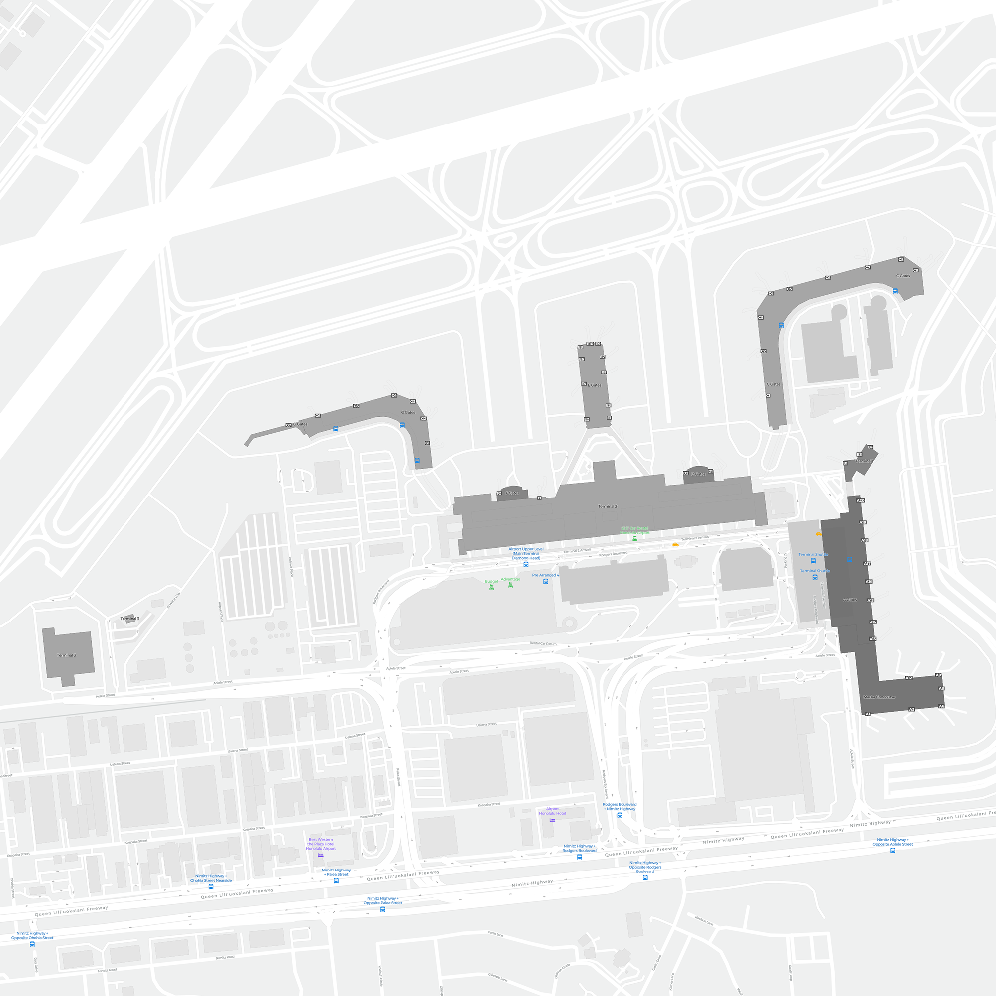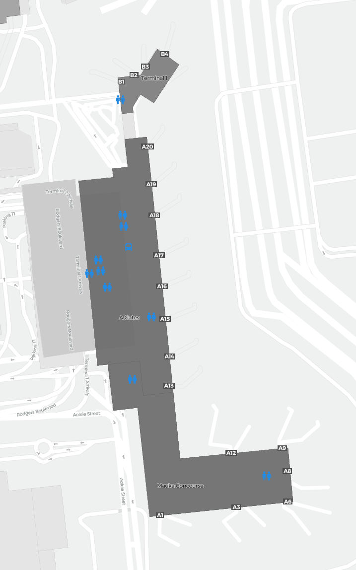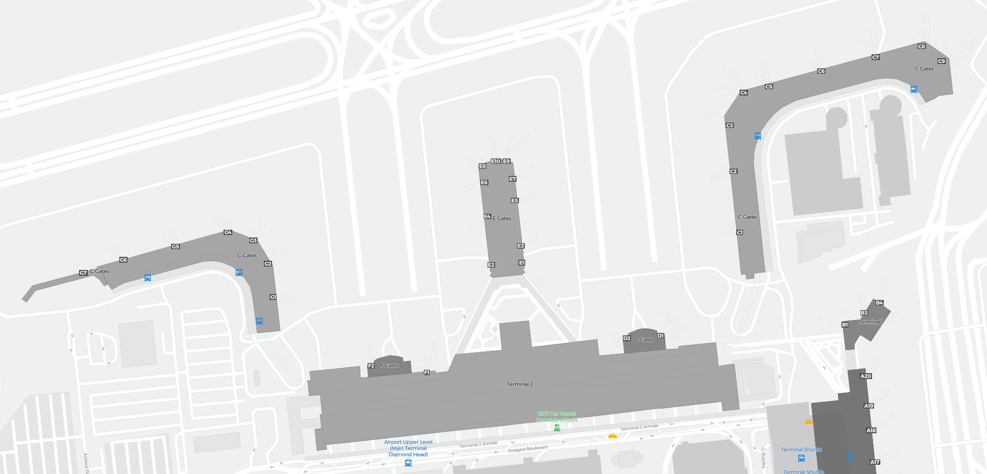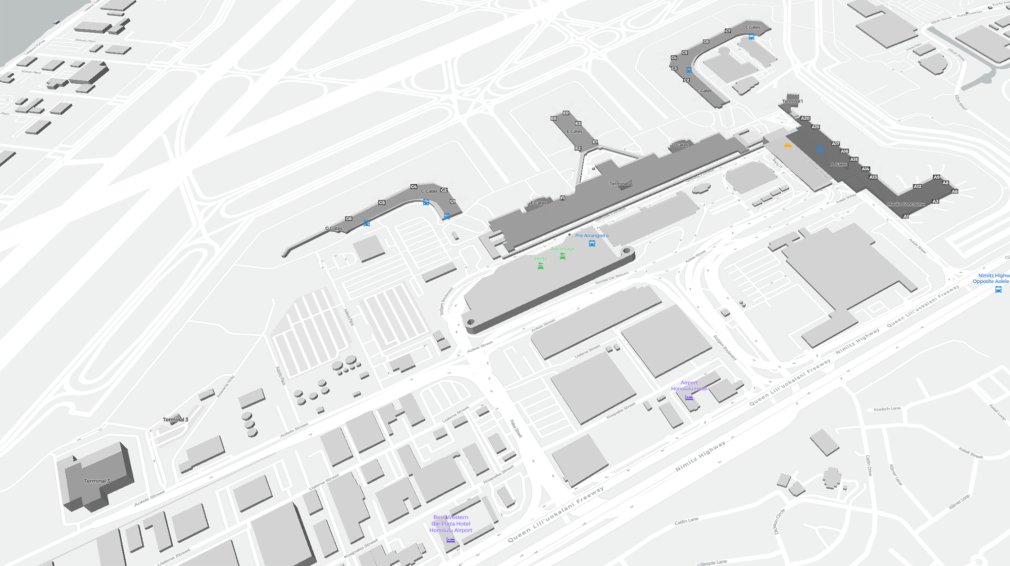 To jest powiększalna mapa nad Honolulu (HNL). Mapa pozwala zobaczyć teren z terminalami, parkingami, a na niektórych lotniskach także szczegóły dotyczące bramek, wypożyczalni samochodów i innych udogodnień przy powiększeniu.