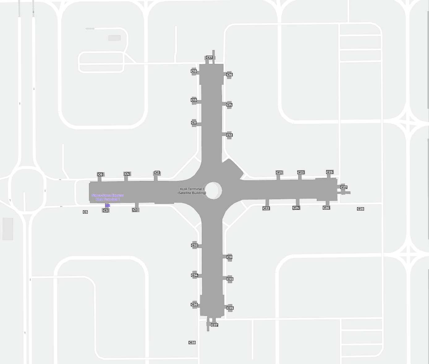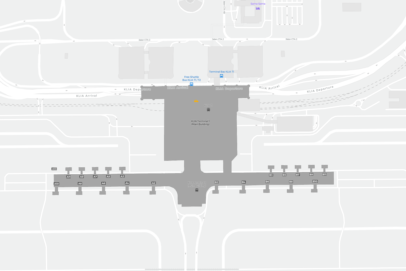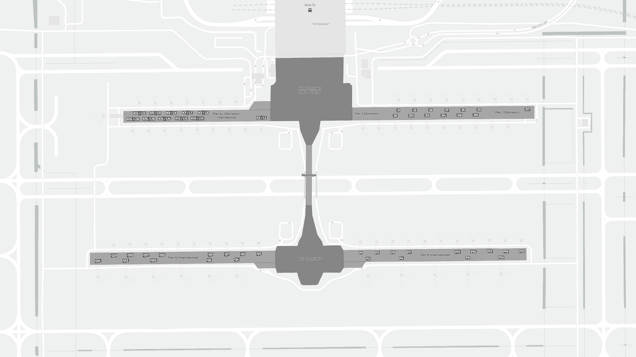 To jest powiększalna mapa nad Kuala Lumpur (KUL). Mapa pozwala zobaczyć teren z terminalami, parkingami, a na niektórych lotniskach także szczegóły dotyczące bramek, wypożyczalni samochodów i innych udogodnień przy powiększeniu.