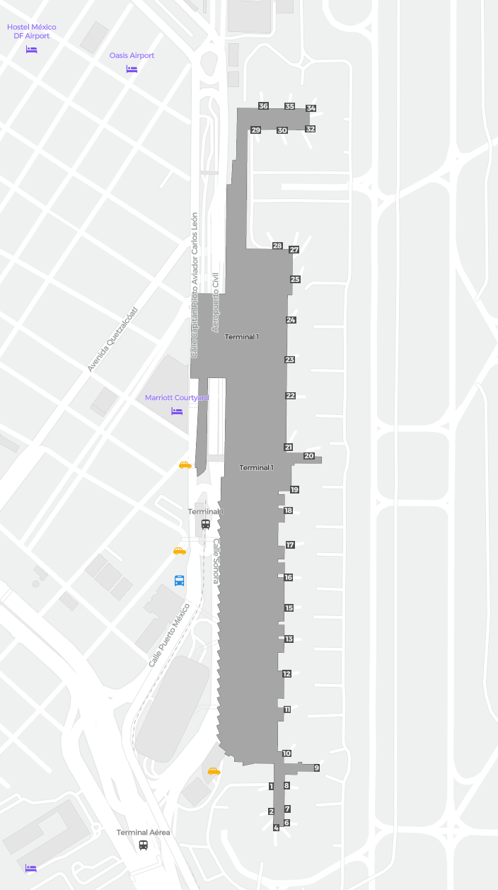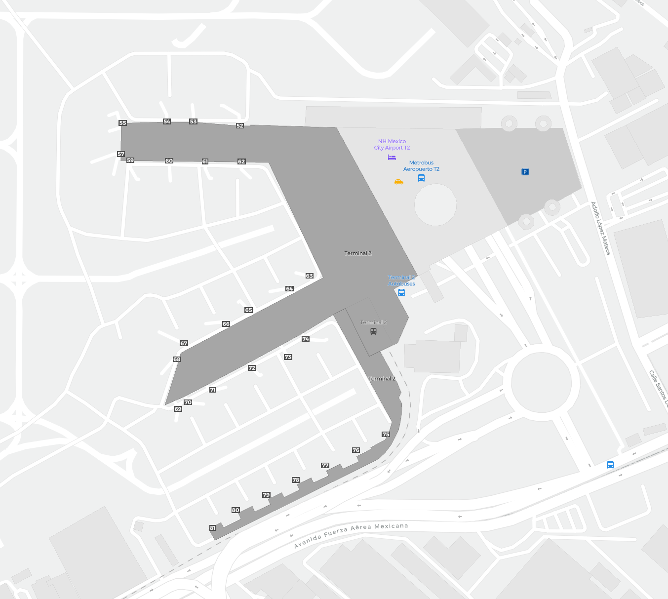 To jest powiększalna mapa nad Meksyk (MEX). Mapa pozwala zobaczyć teren z terminalami, parkingami, a na niektórych lotniskach także szczegóły dotyczące bramek, wypożyczalni samochodów i innych udogodnień przy powiększeniu.