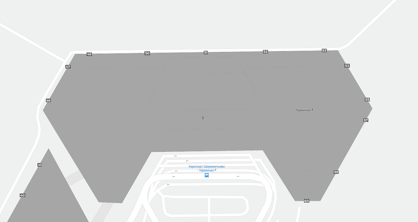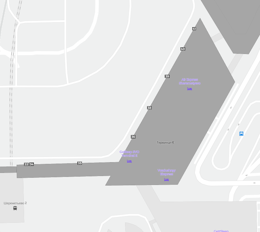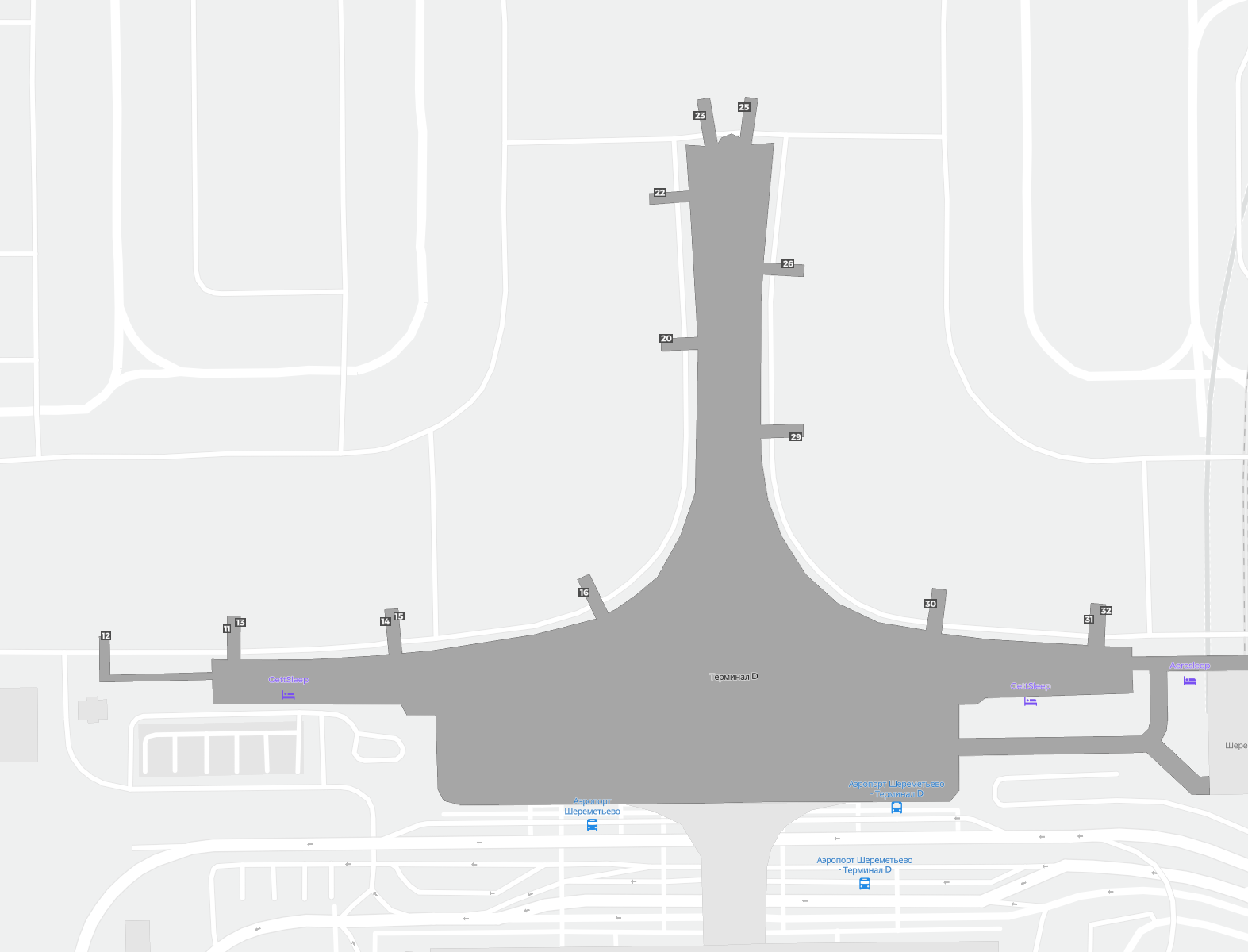 To jest powiększalna mapa nad Moskwa (SVO). Mapa pozwala zobaczyć teren z terminalami, parkingami, a na niektórych lotniskach także szczegóły dotyczące bramek, wypożyczalni samochodów i innych udogodnień przy powiększeniu.