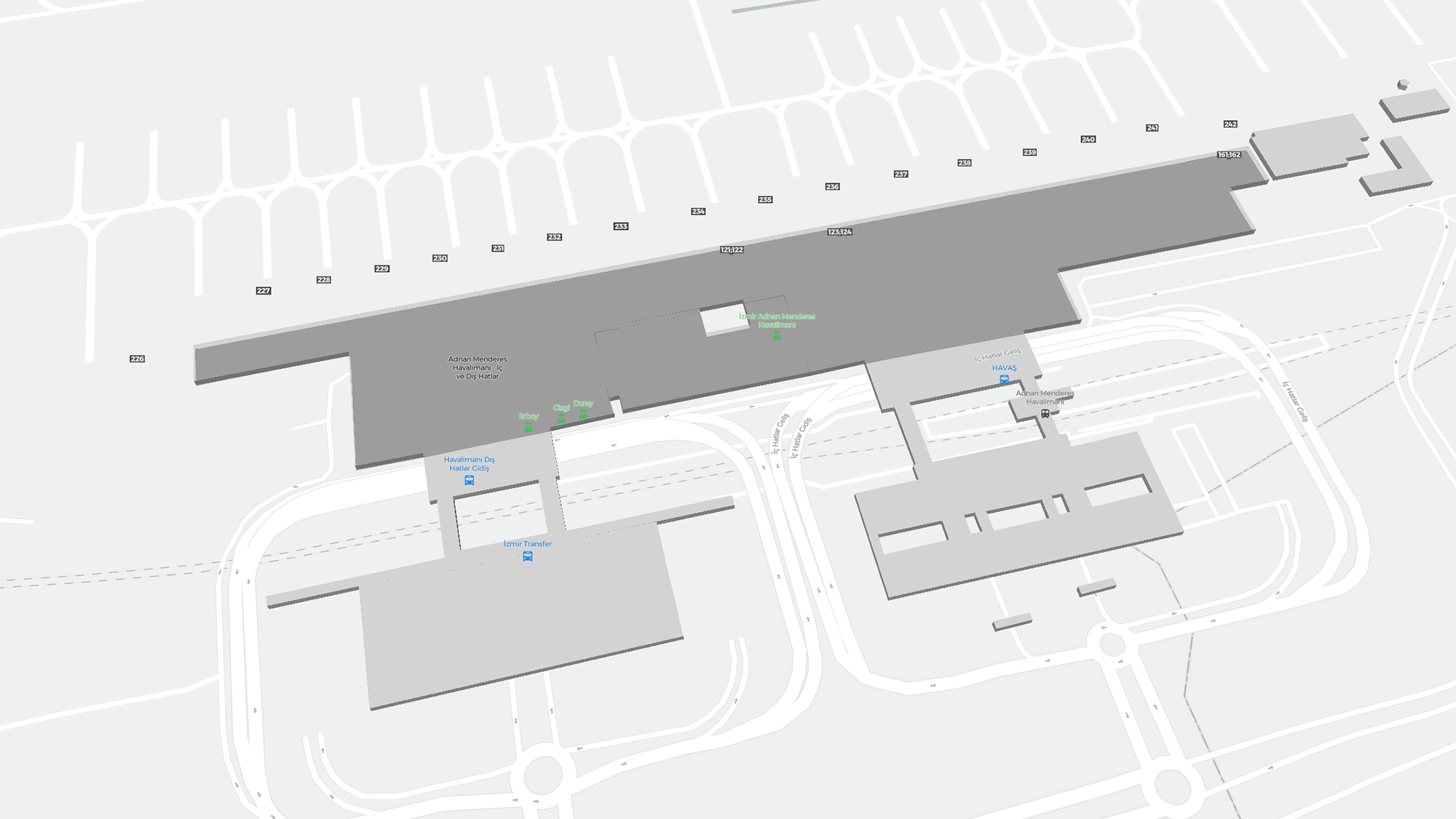 To jest powiększalna mapa nad Izmir (ADB). Mapa pozwala zobaczyć teren z terminalami, parkingami, a na niektórych lotniskach także szczegóły dotyczące bramek, wypożyczalni samochodów i innych udogodnień przy powiększeniu.