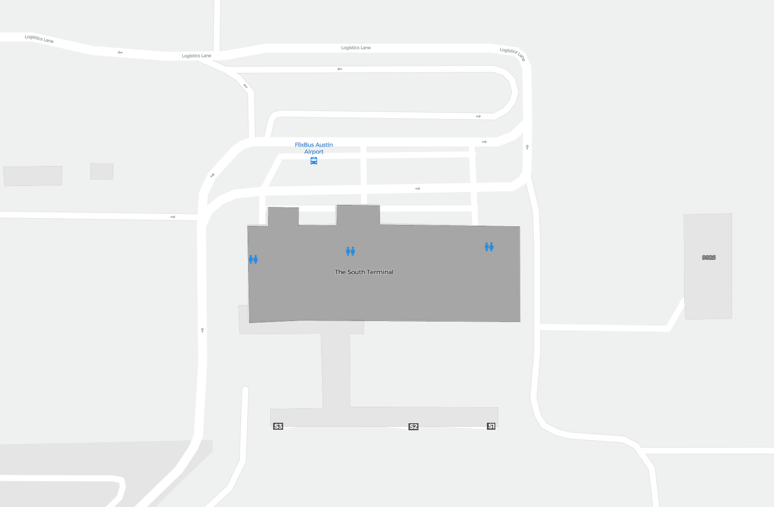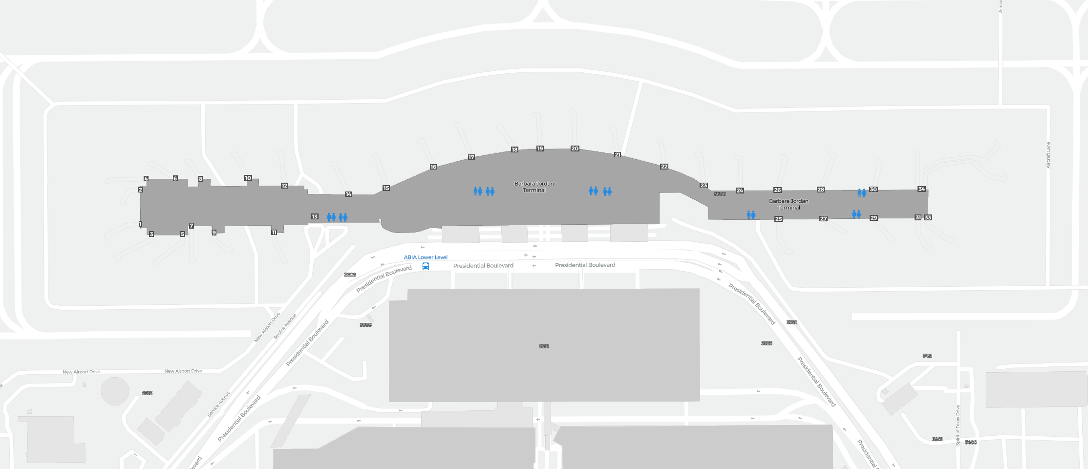 To jest powiększalna mapa nad Austin (AUS). Mapa pozwala zobaczyć teren z terminalami, parkingami, a na niektórych lotniskach także szczegóły dotyczące bramek, wypożyczalni samochodów i innych udogodnień przy powiększeniu.