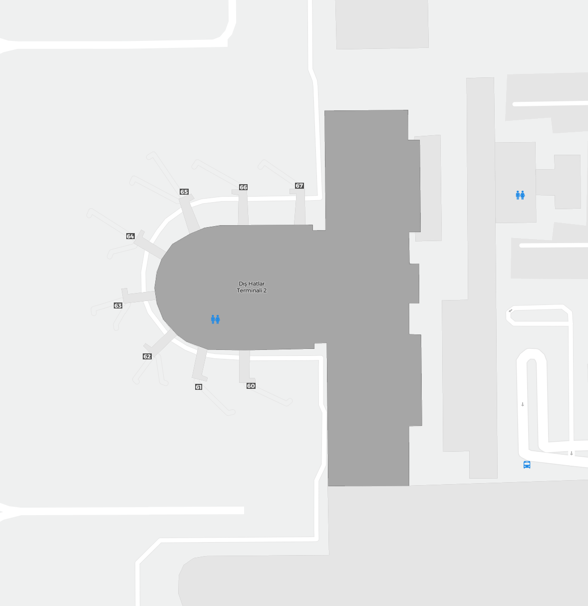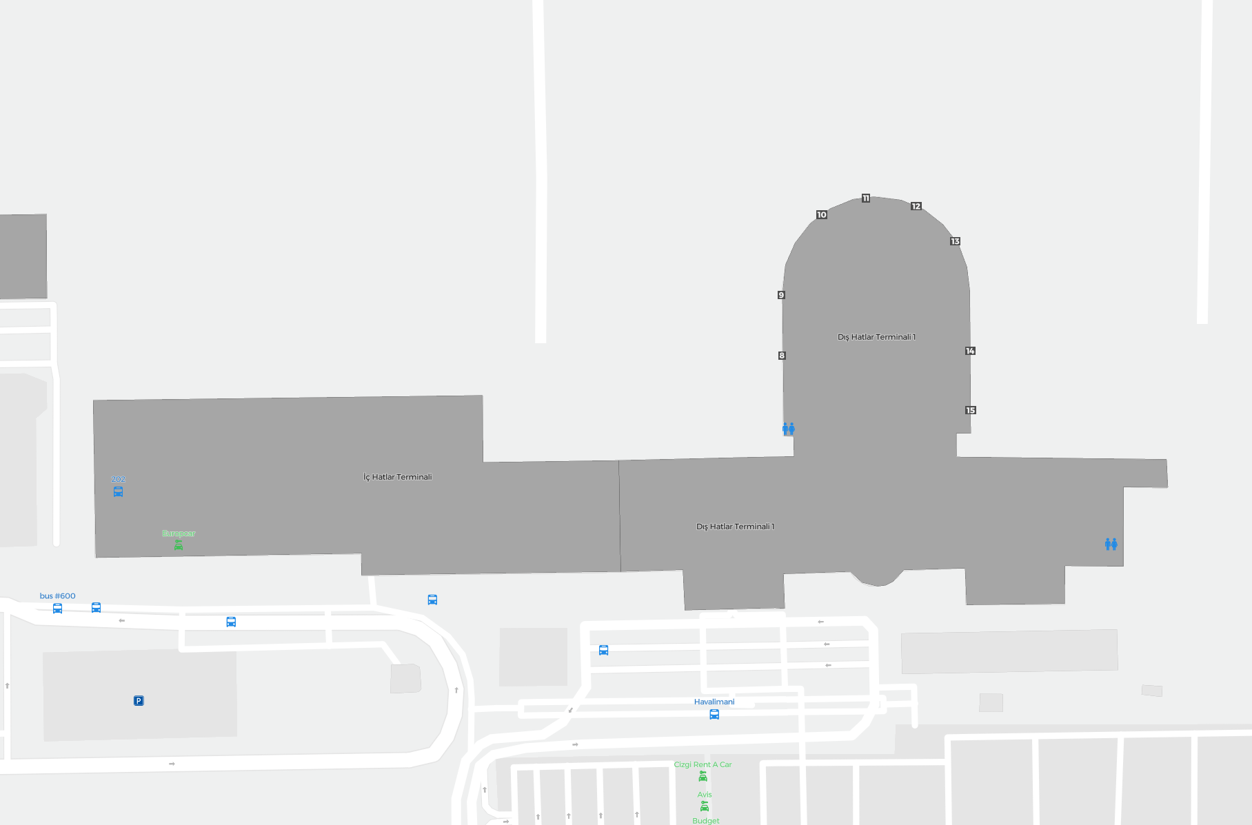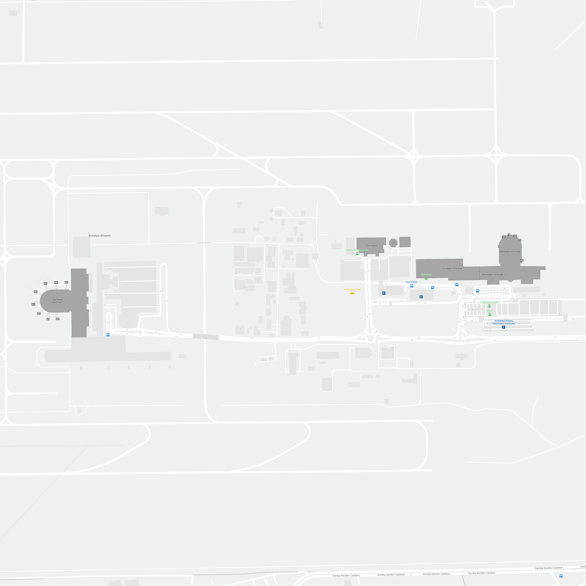 To jest powiększalna mapa nad Antalya (AYT). Mapa pozwala zobaczyć teren z terminalami, parkingami, a na niektórych lotniskach także szczegóły dotyczące bramek, wypożyczalni samochodów i innych udogodnień przy powiększeniu.
