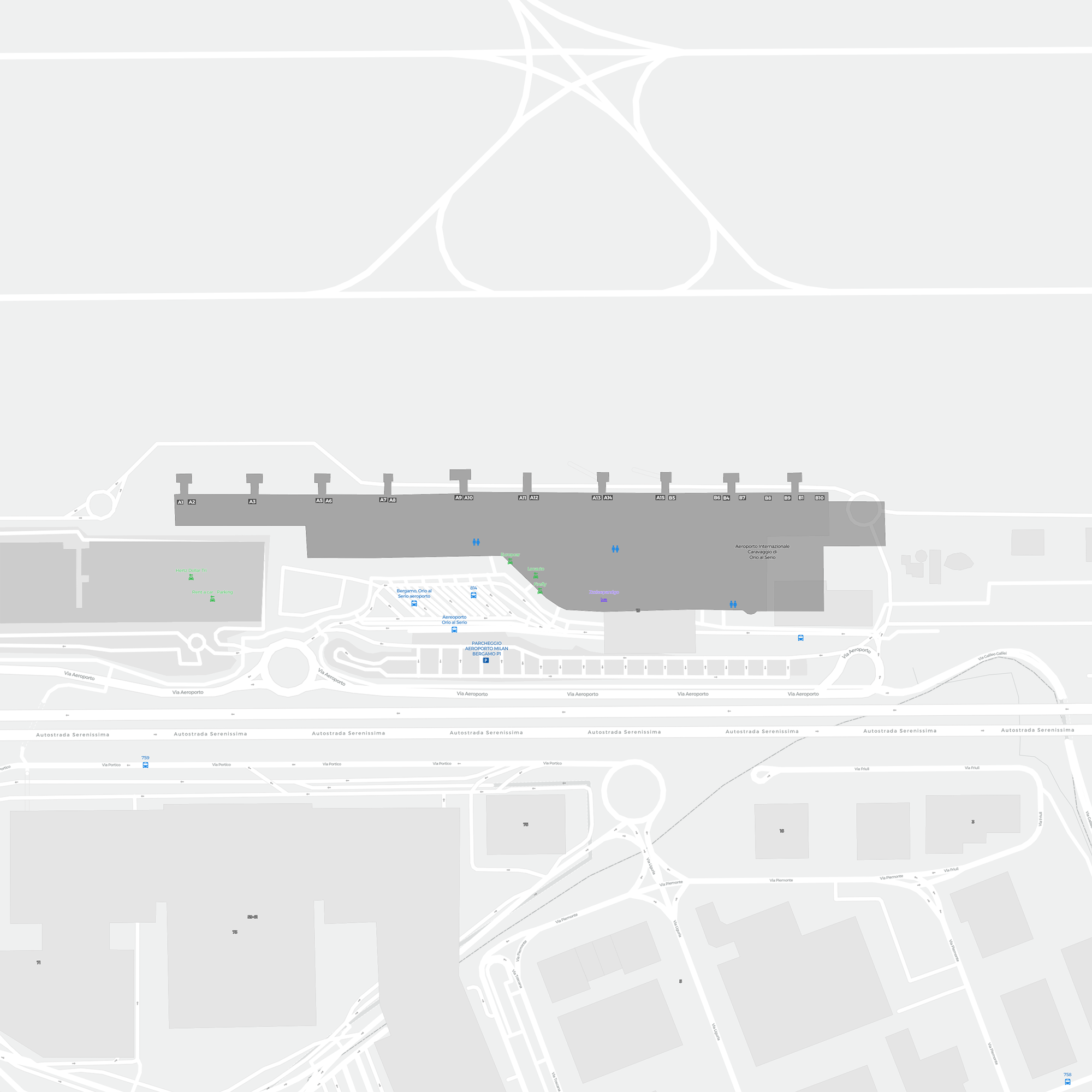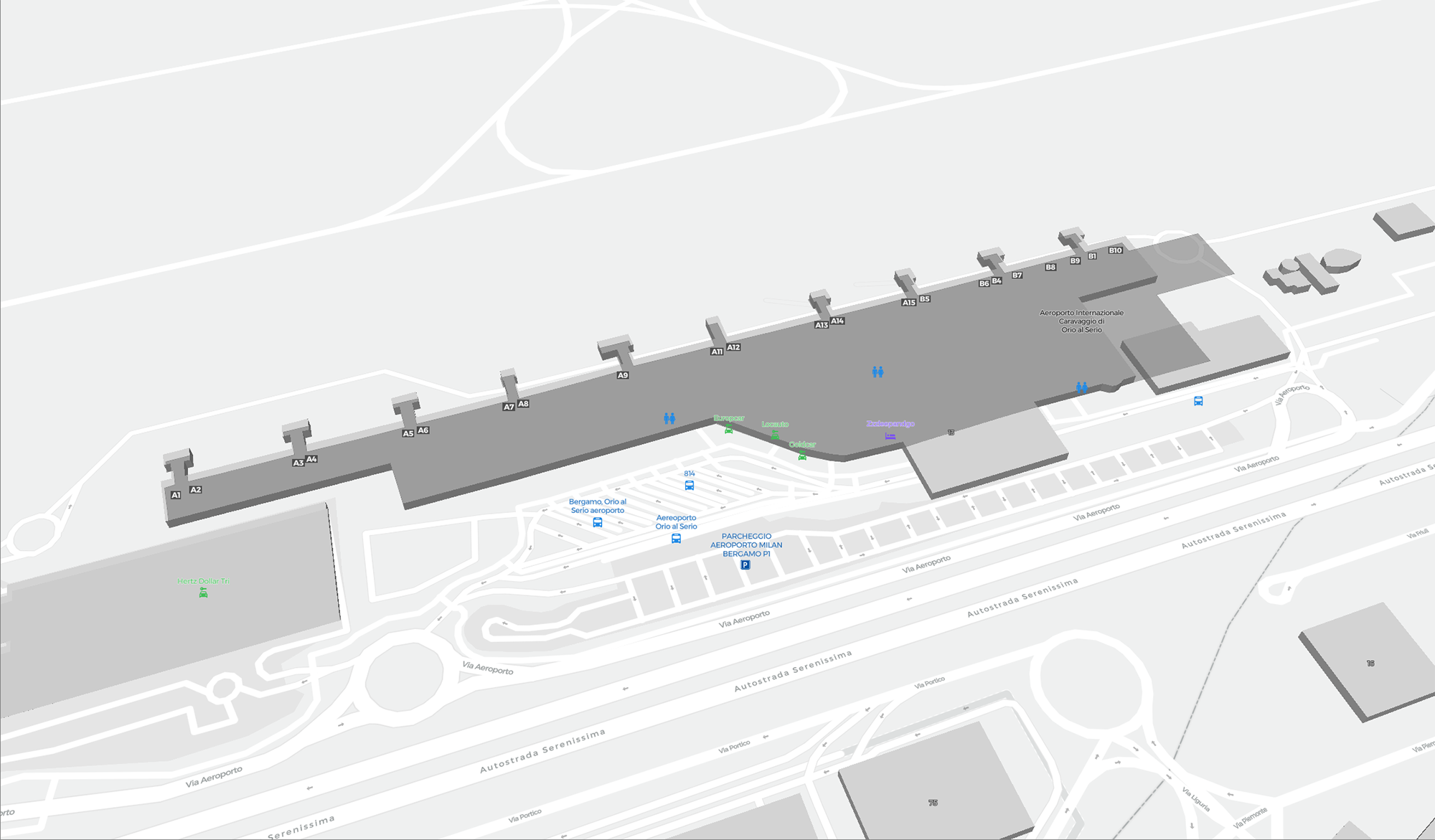 To jest powiększalna mapa nad Bergamo (BGY). Mapa pozwala zobaczyć teren z terminalami, parkingami, a na niektórych lotniskach także szczegóły dotyczące bramek, wypożyczalni samochodów i innych udogodnień przy powiększeniu.