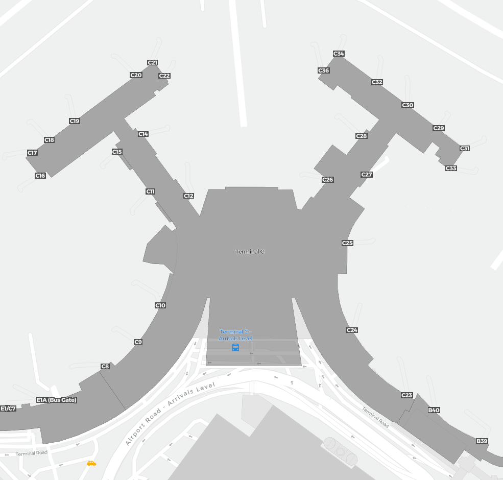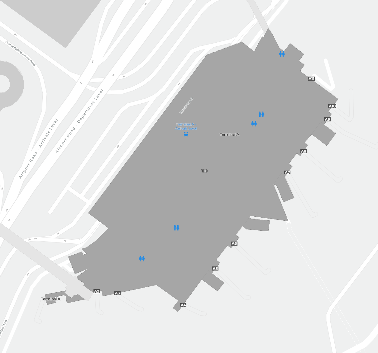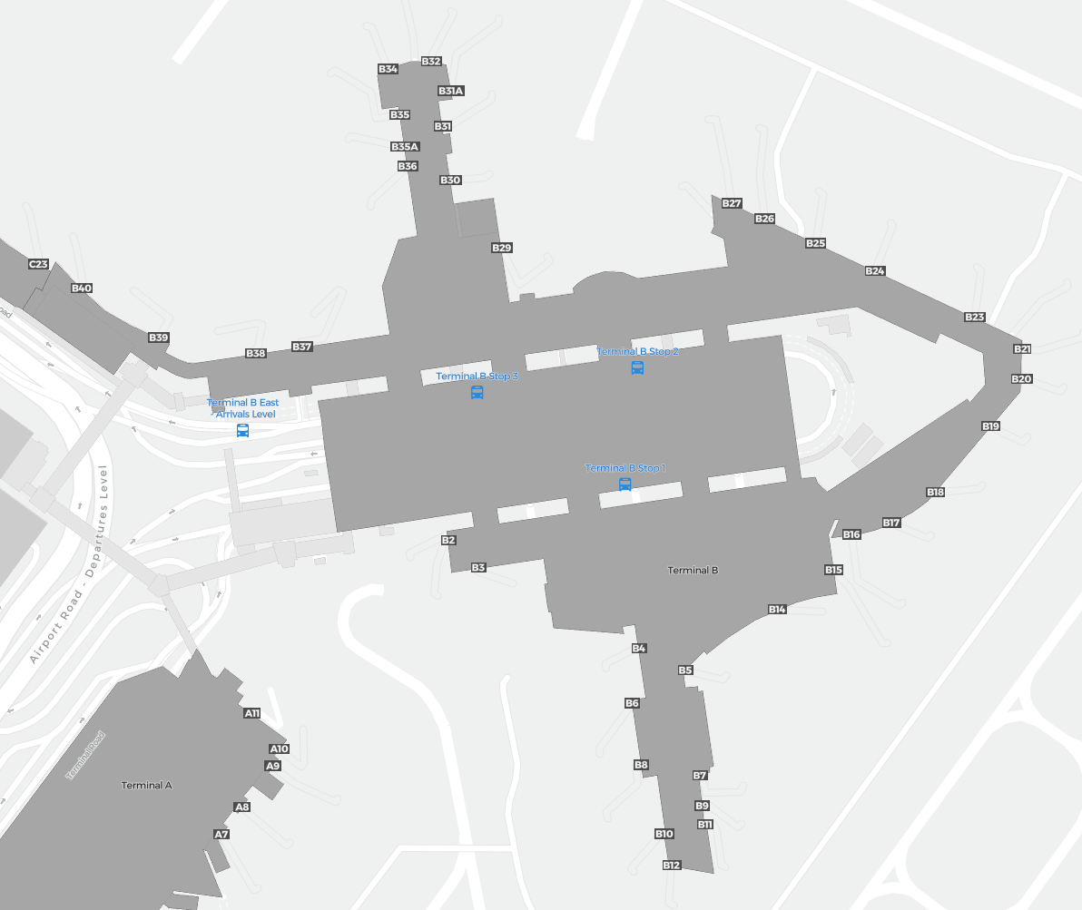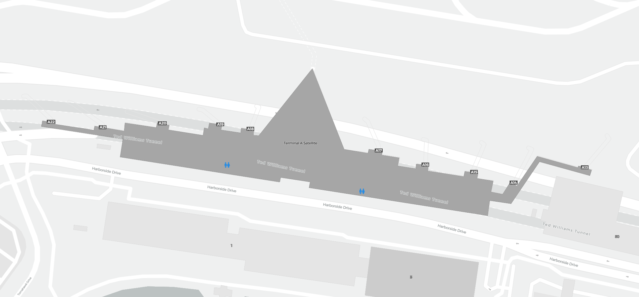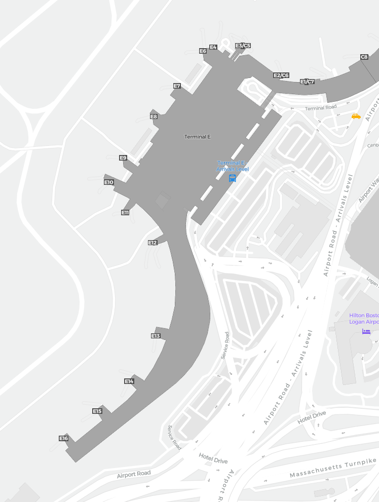 To jest powiększalna mapa nad Boston (BOS). Mapa pozwala zobaczyć teren z terminalami, parkingami, a na niektórych lotniskach także szczegóły dotyczące bramek, wypożyczalni samochodów i innych udogodnień przy powiększeniu.