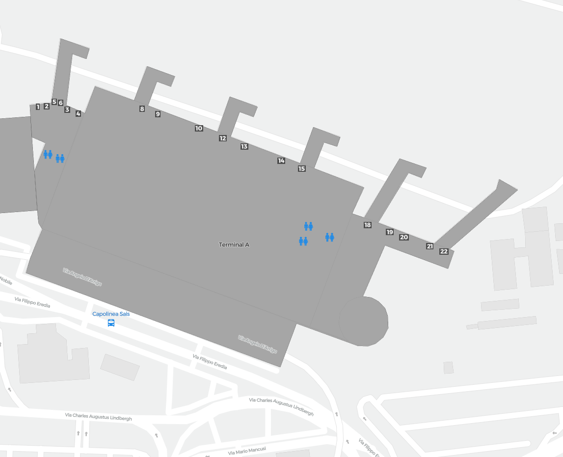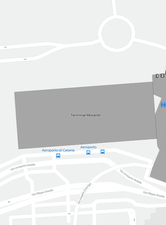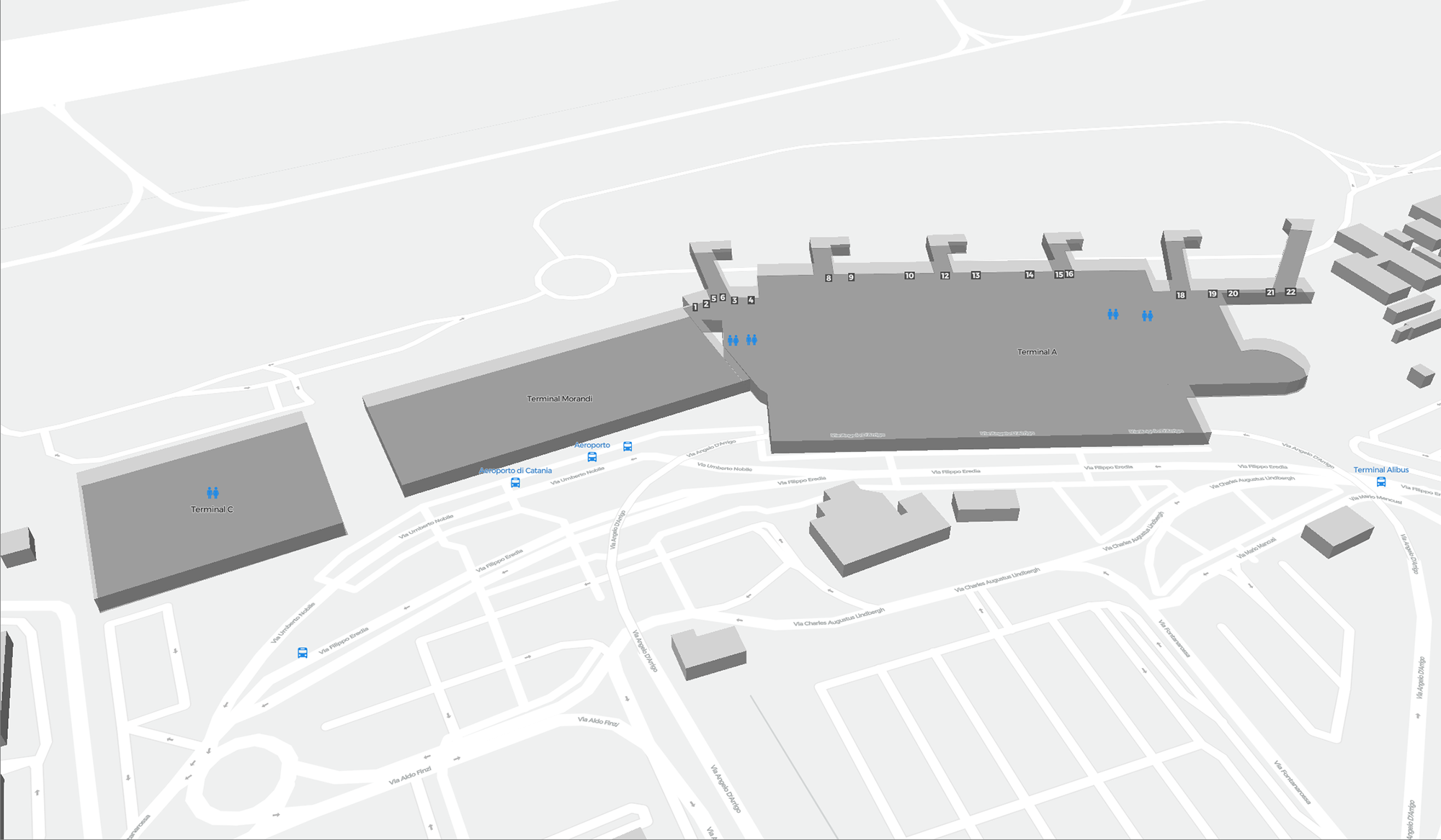 To jest powiększalna mapa nad Katania (CTA). Mapa pozwala zobaczyć teren z terminalami, parkingami, a na niektórych lotniskach także szczegóły dotyczące bramek, wypożyczalni samochodów i innych udogodnień przy powiększeniu.