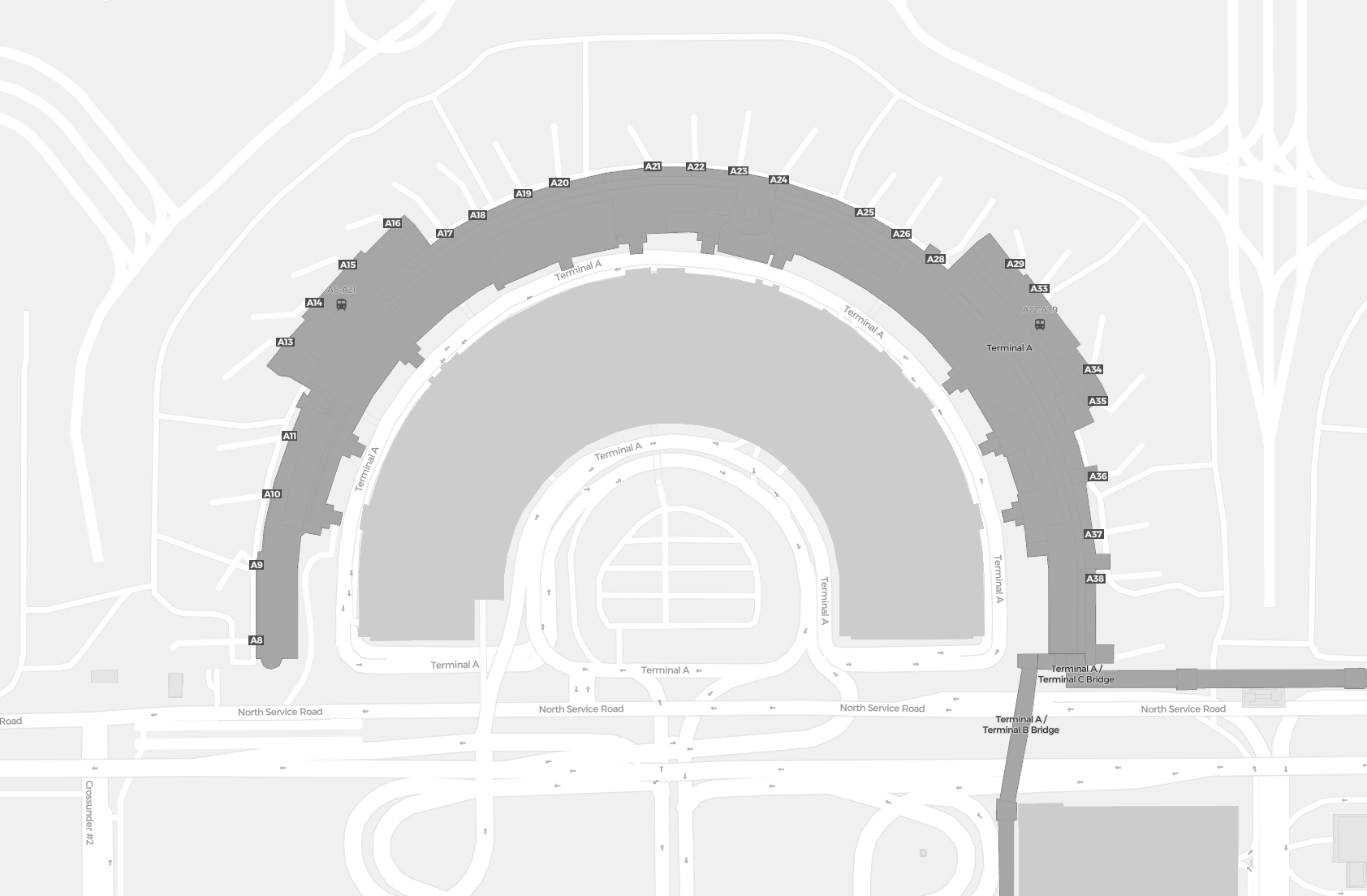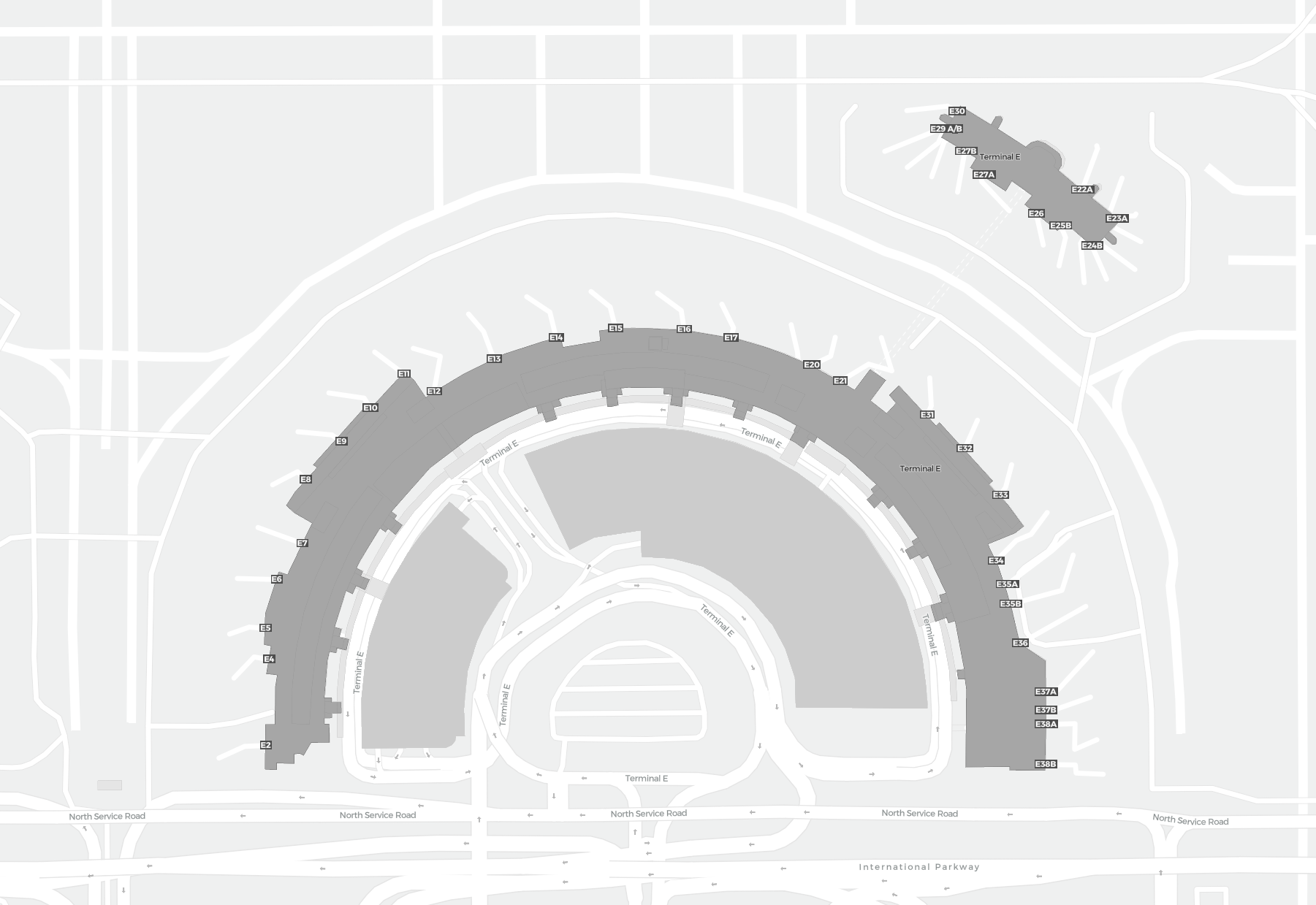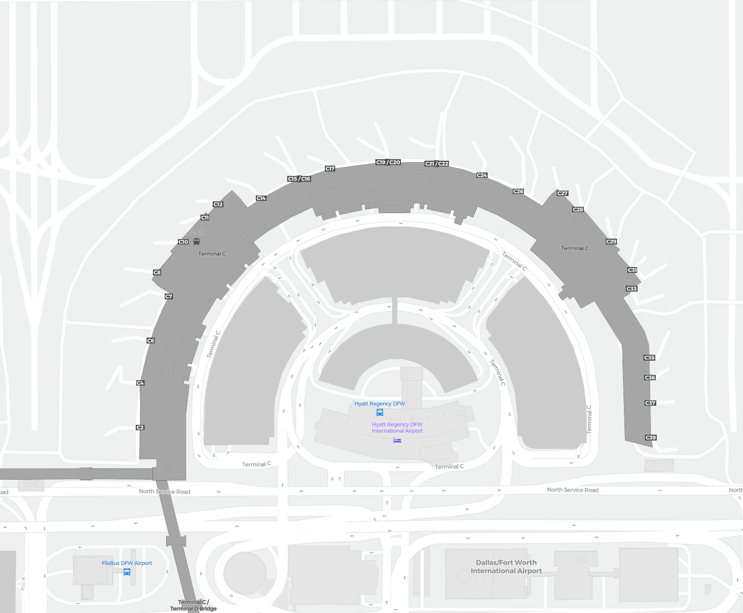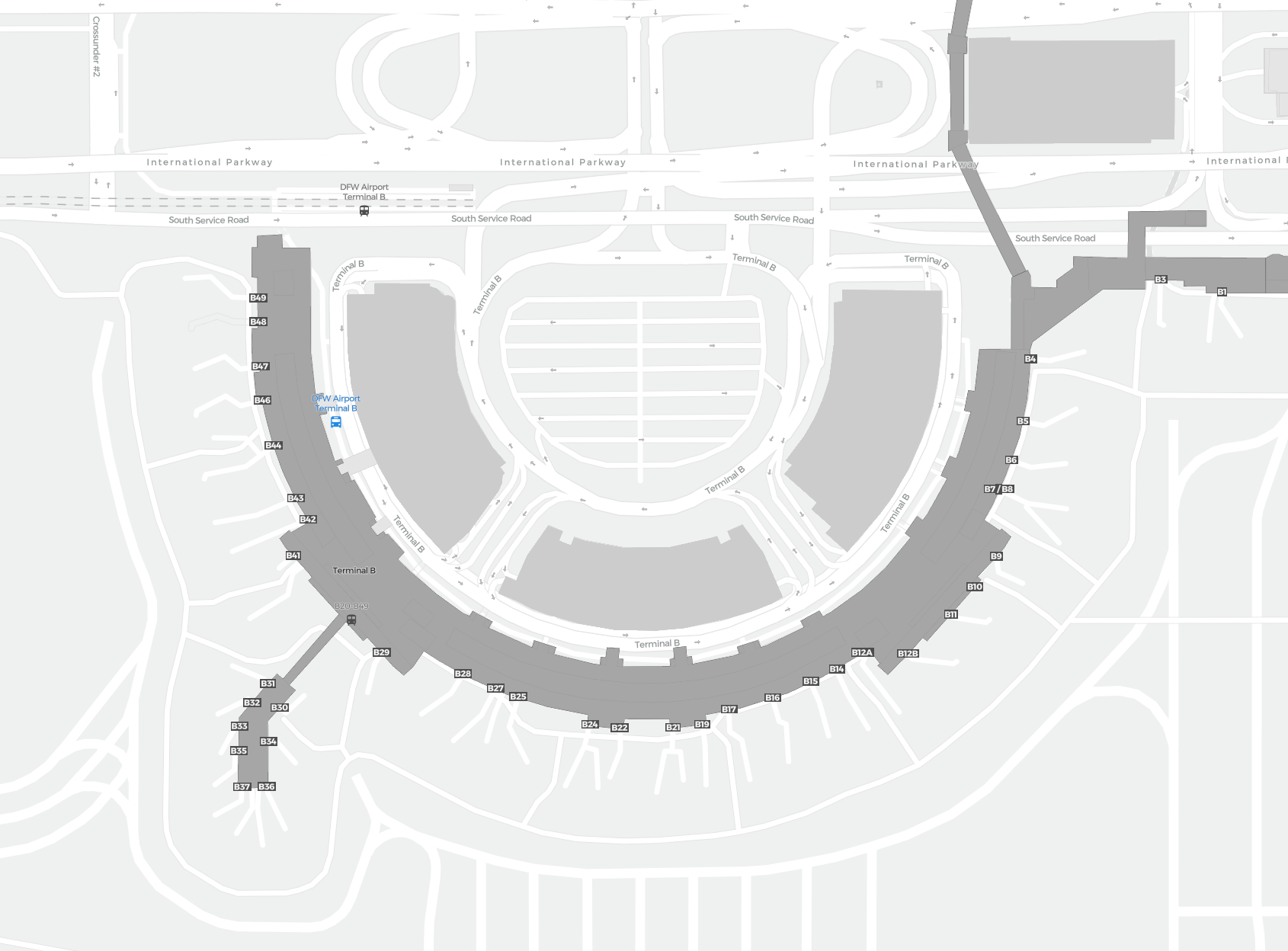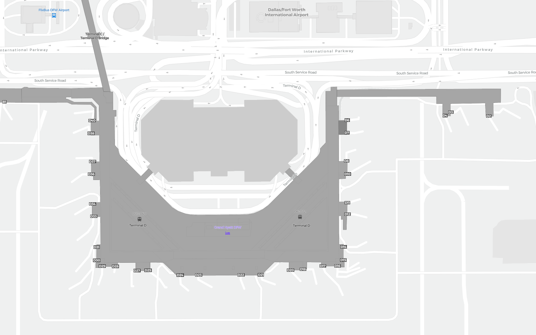 To jest powiększalna mapa nad Dallas (DFW). Mapa pozwala zobaczyć teren z terminalami, parkingami, a na niektórych lotniskach także szczegóły dotyczące bramek, wypożyczalni samochodów i innych udogodnień przy powiększeniu.