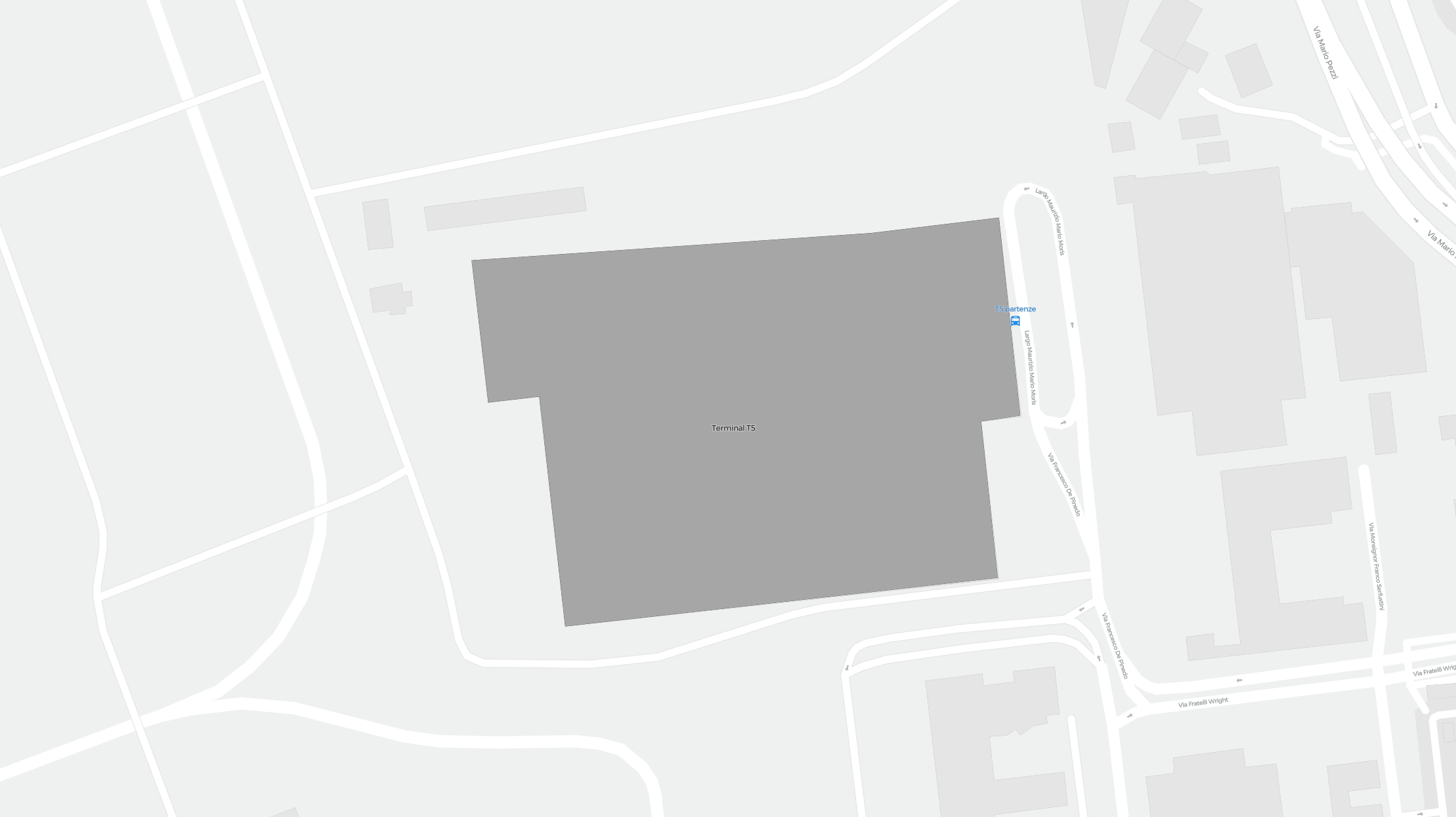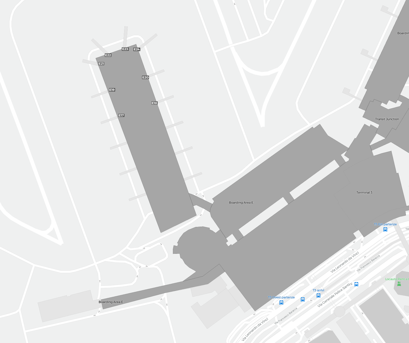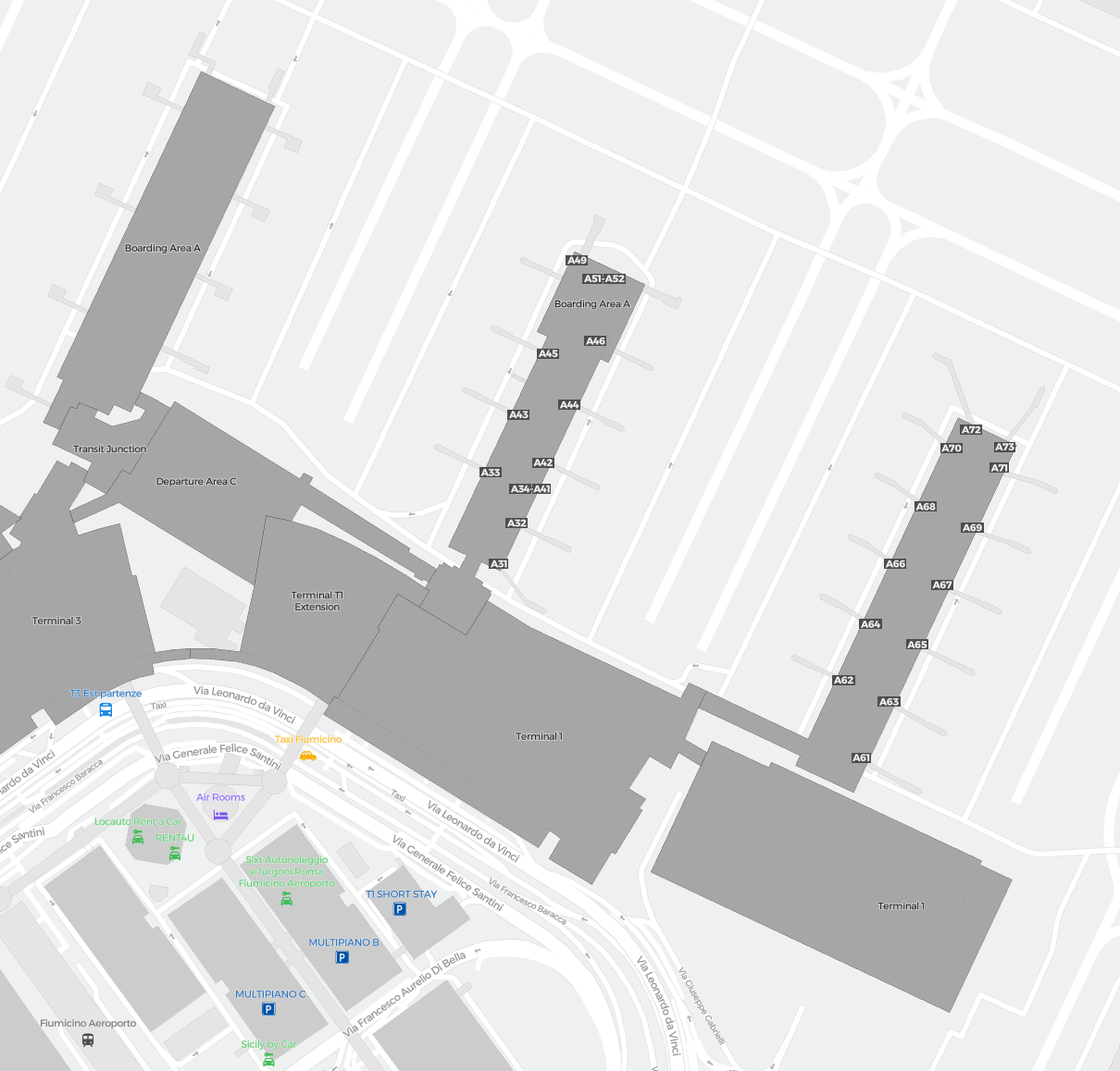 To jest powiększalna mapa nad Rzym (FCO). Mapa pozwala zobaczyć teren z terminalami, parkingami, a na niektórych lotniskach także szczegóły dotyczące bramek, wypożyczalni samochodów i innych udogodnień przy powiększeniu.