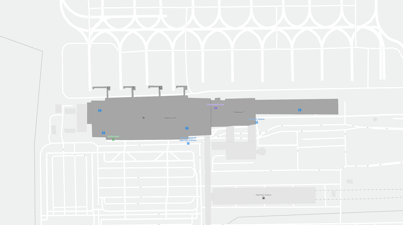 To jest powiększalna mapa nad Kazań (KZN). Mapa pozwala zobaczyć teren z terminalami, parkingami, a na niektórych lotniskach także szczegóły dotyczące bramek, wypożyczalni samochodów i innych udogodnień przy powiększeniu.