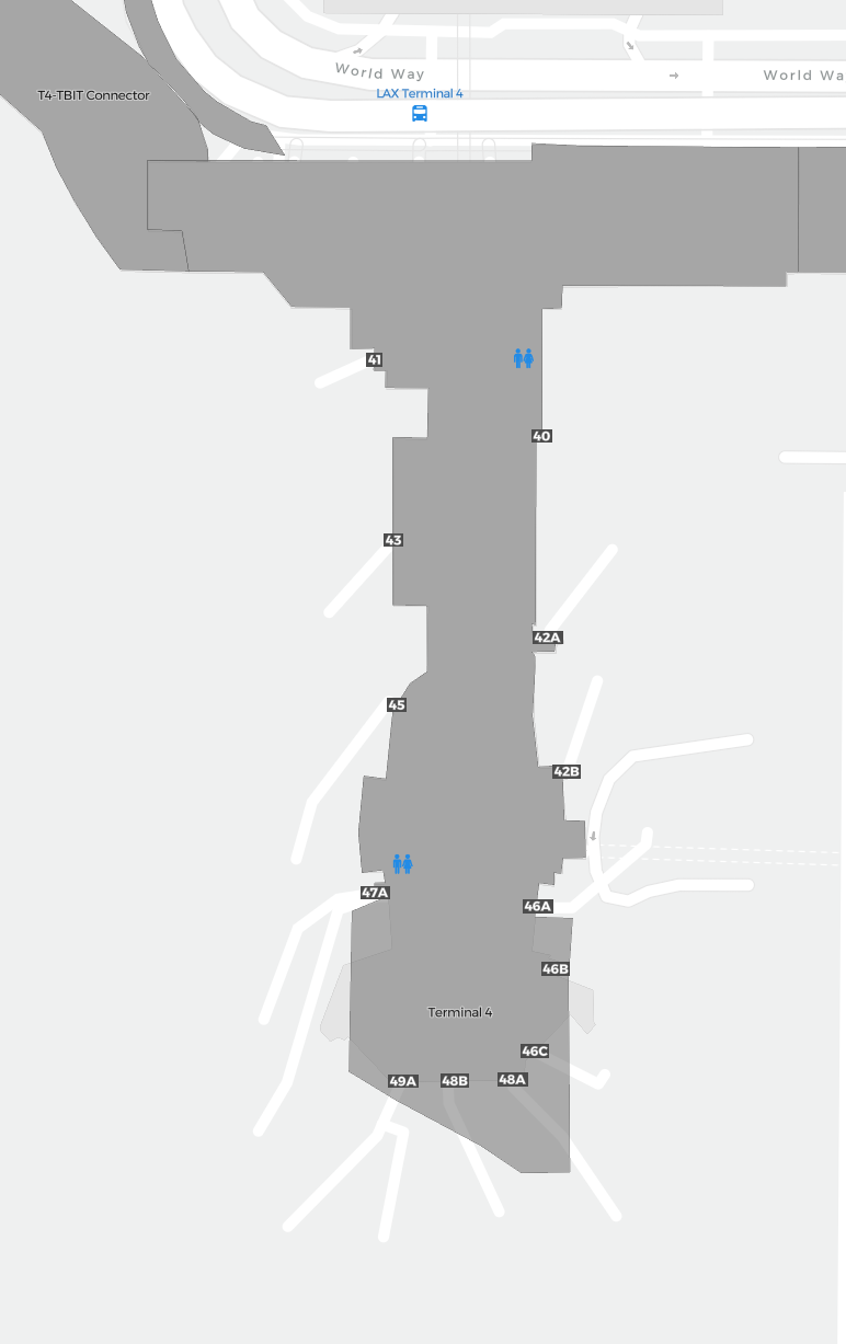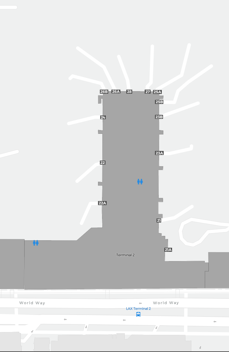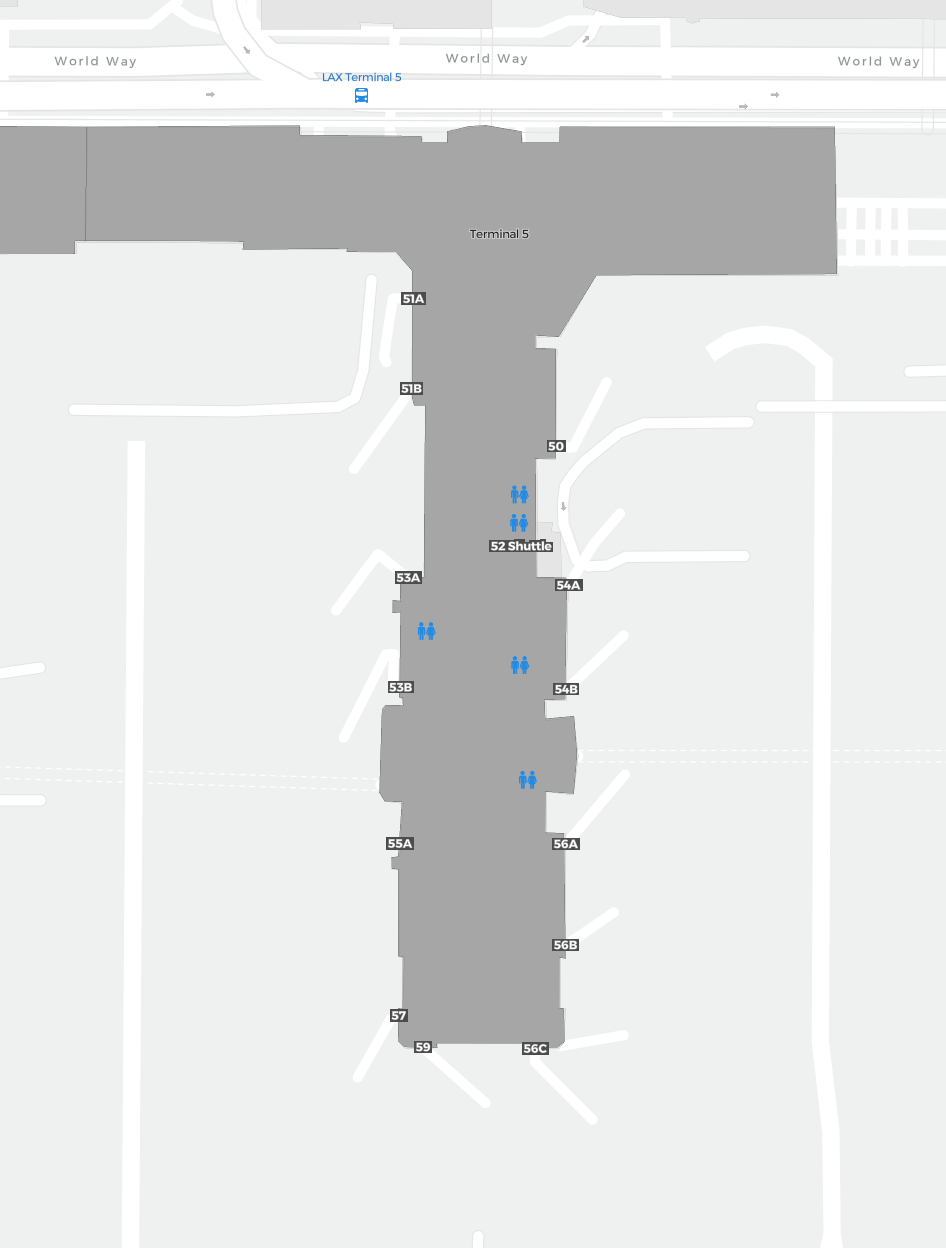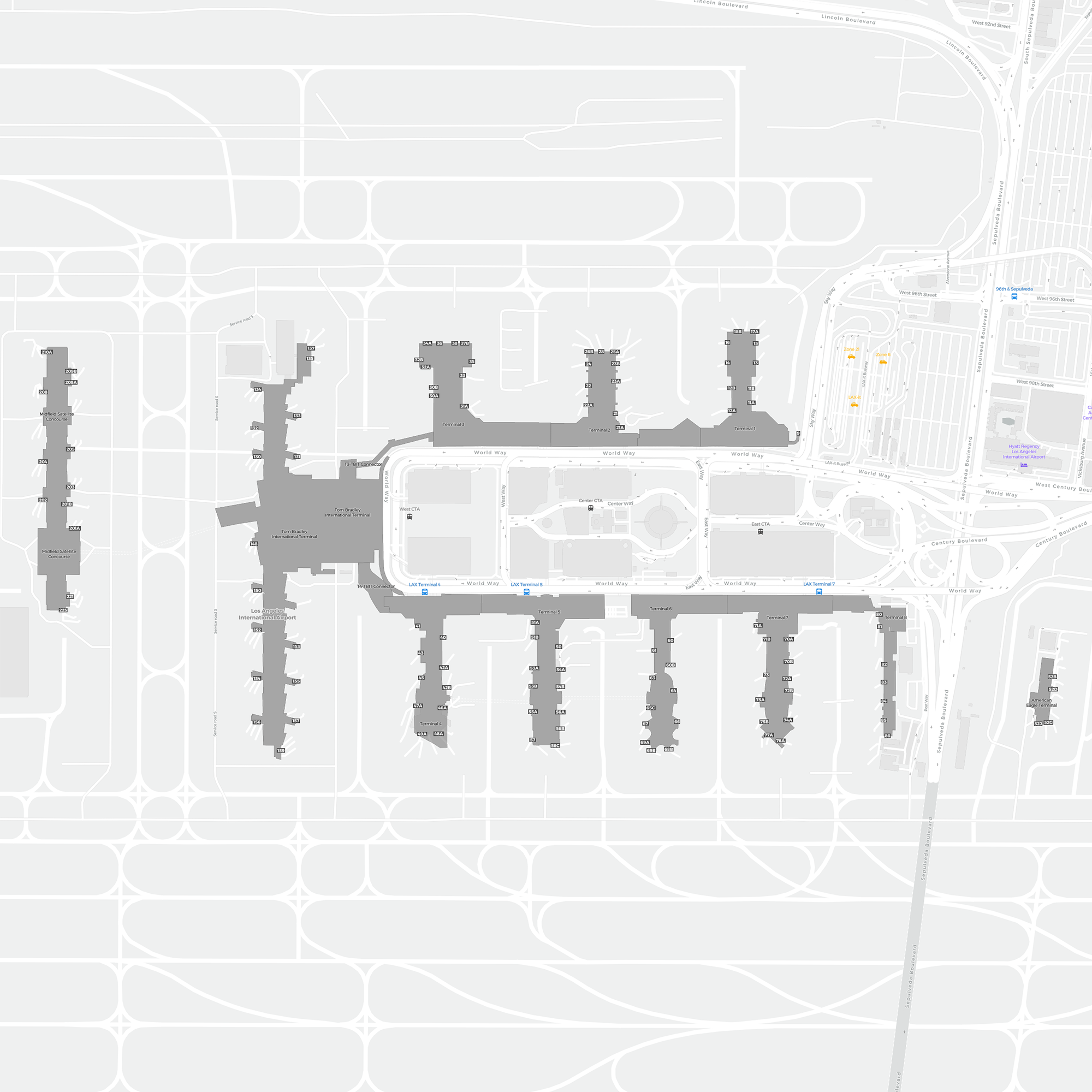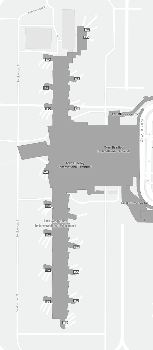 To jest powiększalna mapa nad Los Angeles (LAX). Mapa pozwala zobaczyć teren z terminalami, parkingami, a na niektórych lotniskach także szczegóły dotyczące bramek, wypożyczalni samochodów i innych udogodnień przy powiększeniu.