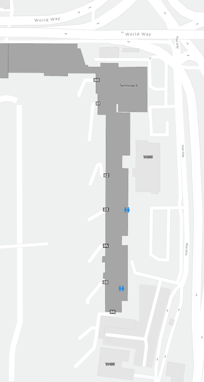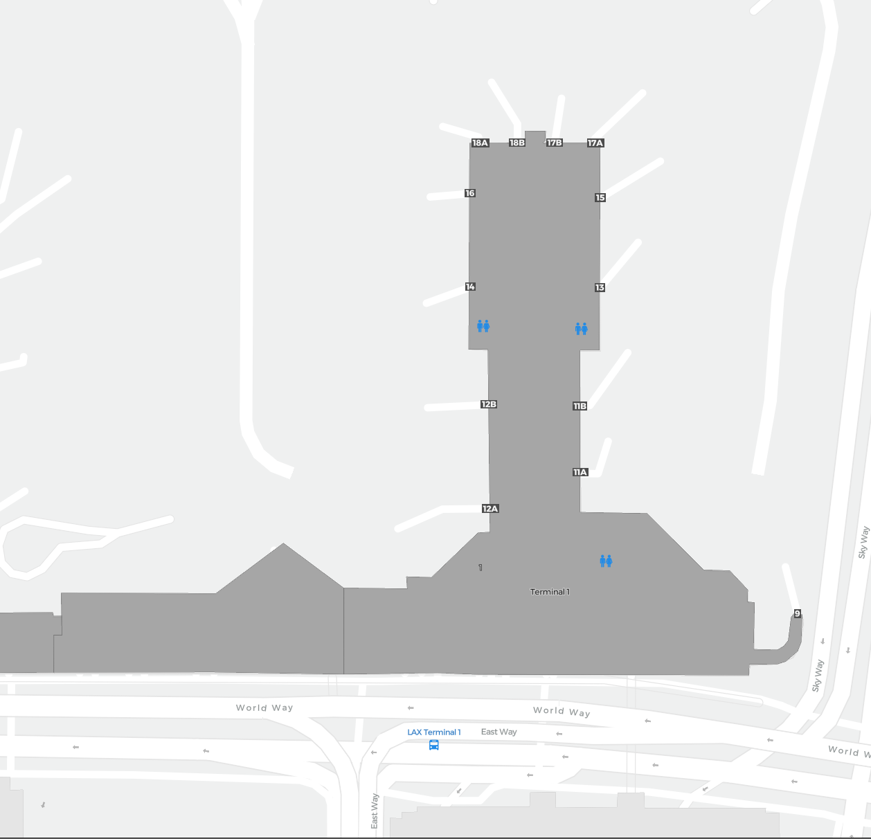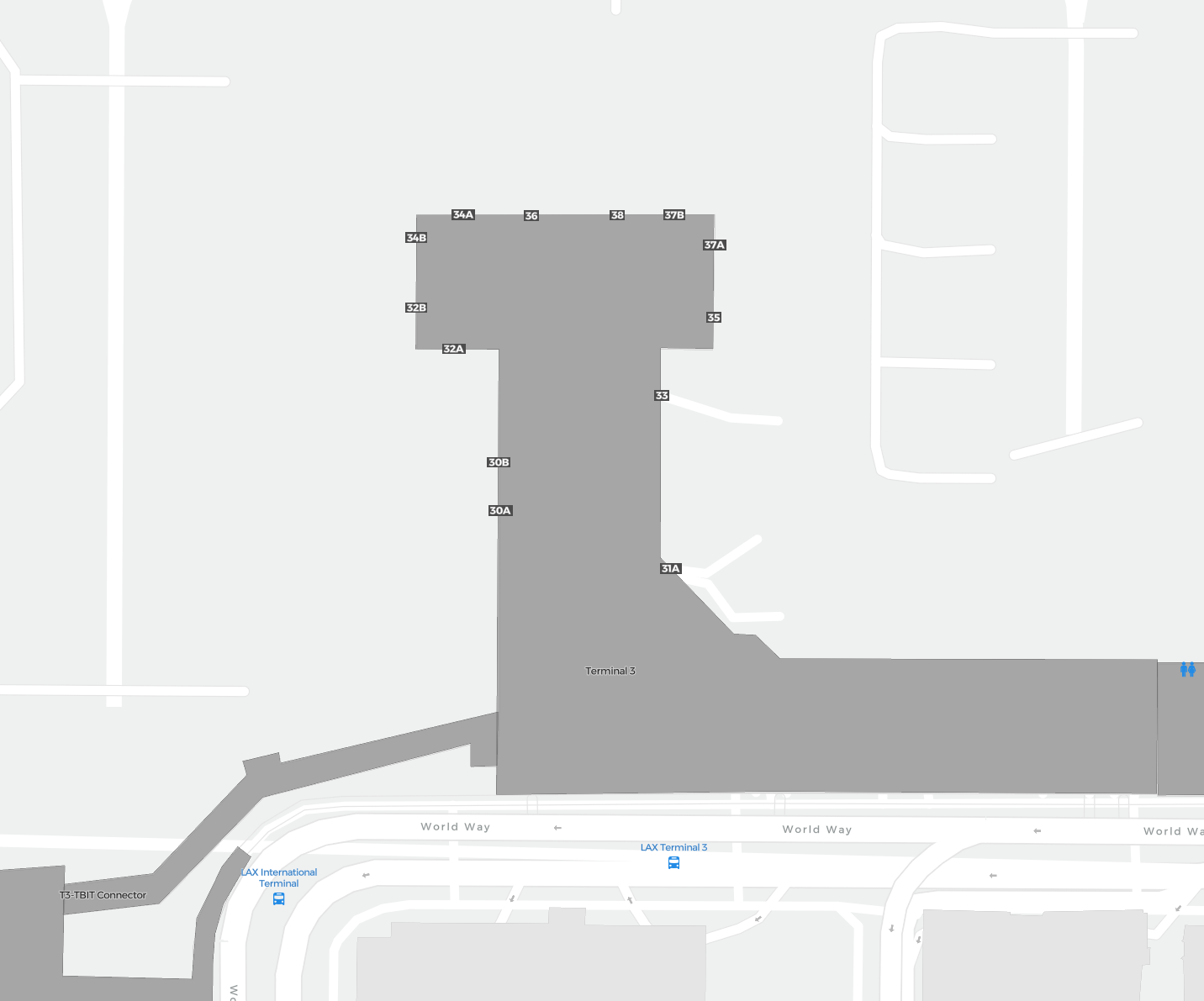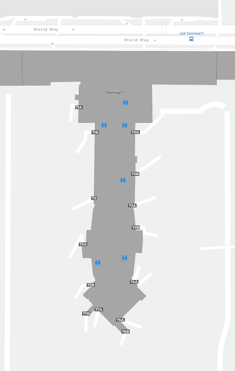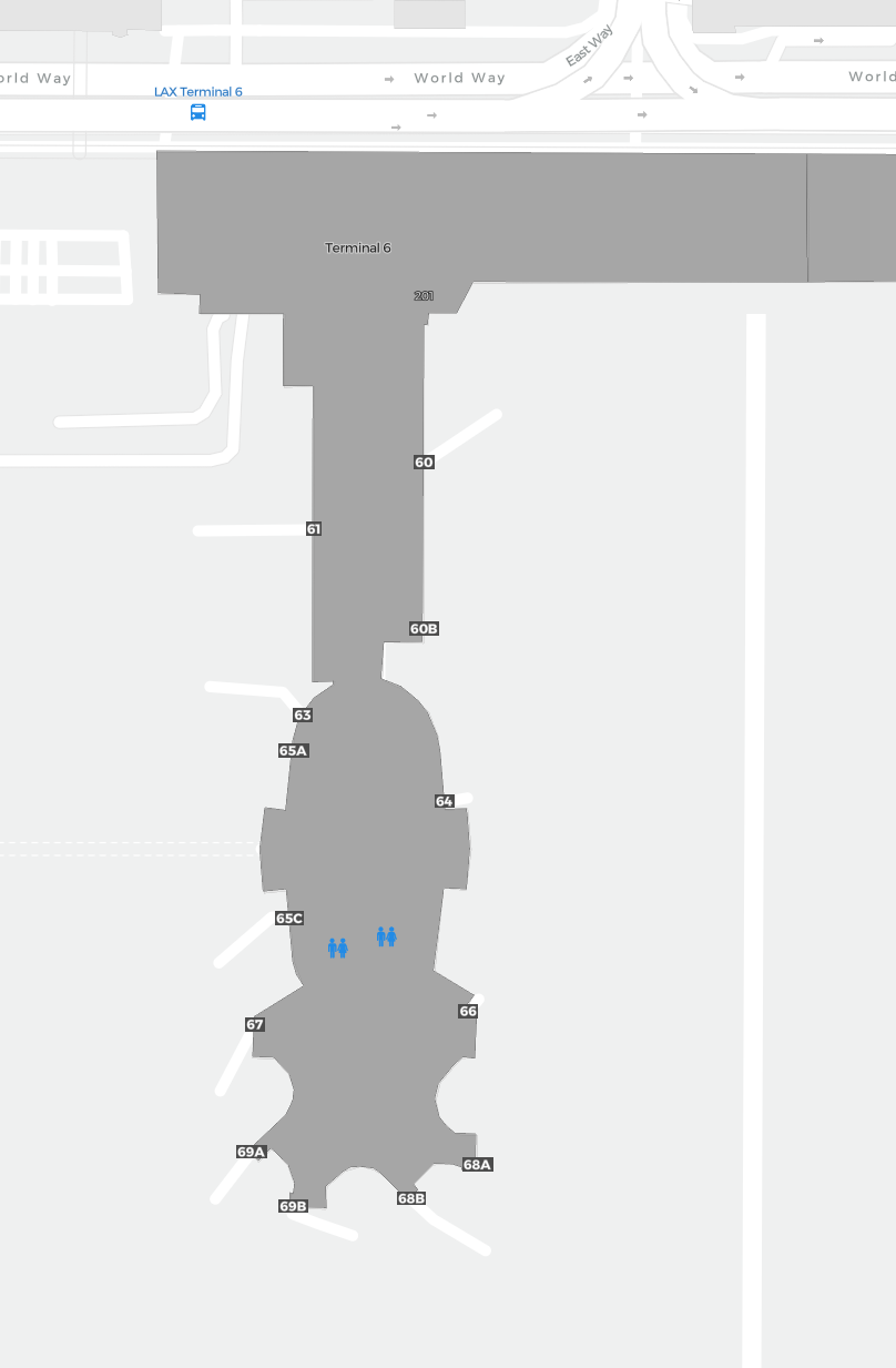To jest powiększalna mapa nad Los Angeles (LAX). Mapa pozwala zobaczyć teren z terminalami, parkingami, a na niektórych lotniskach także szczegóły dotyczące bramek, wypożyczalni samochodów i innych udogodnień przy powiększeniu.