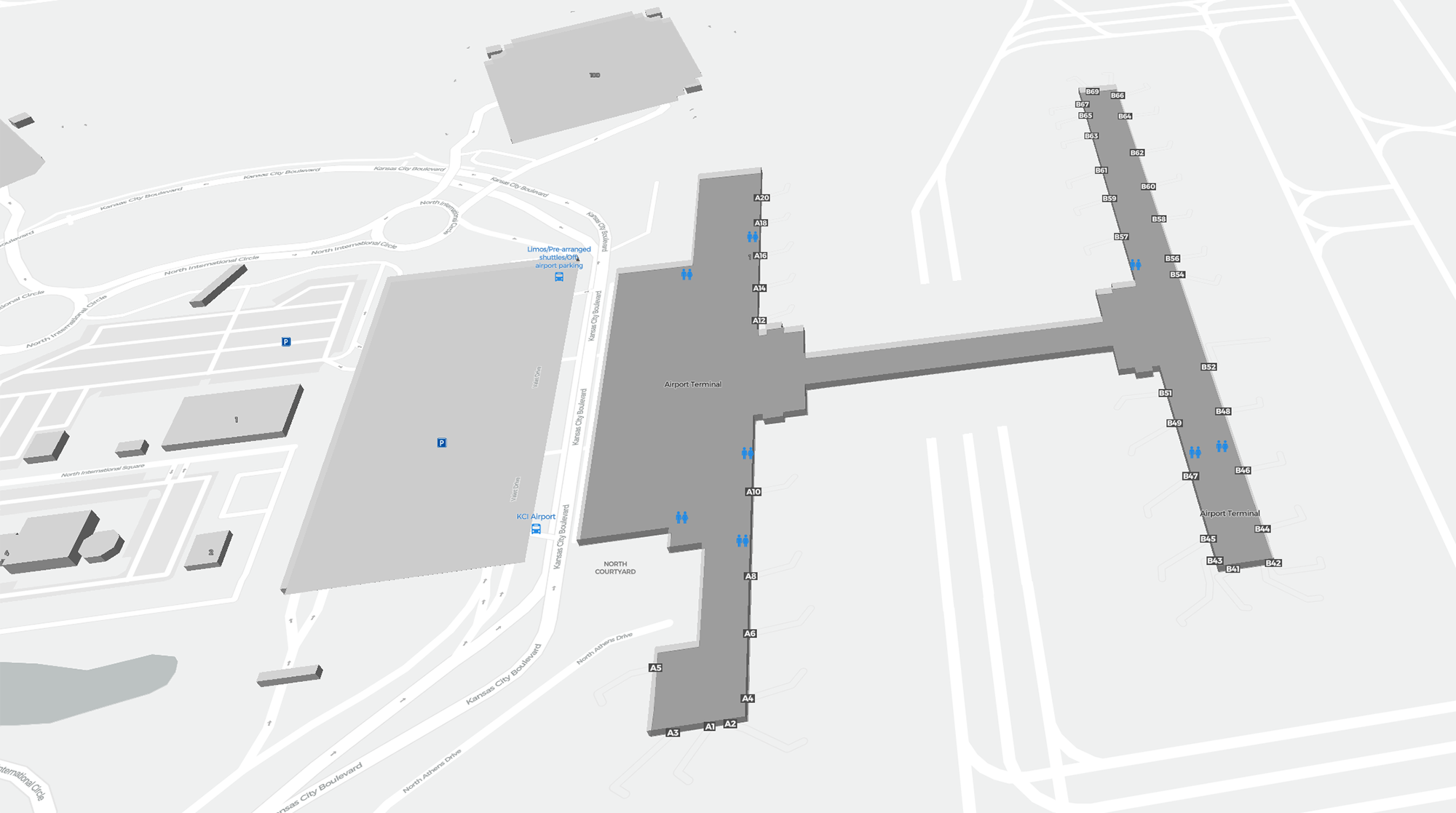 To jest powiększalna mapa nad Kansas City (MCI). Mapa pozwala zobaczyć teren z terminalami, parkingami, a na niektórych lotniskach także szczegóły dotyczące bramek, wypożyczalni samochodów i innych udogodnień przy powiększeniu.