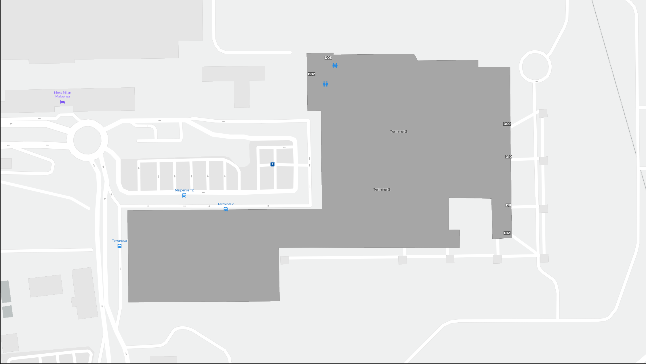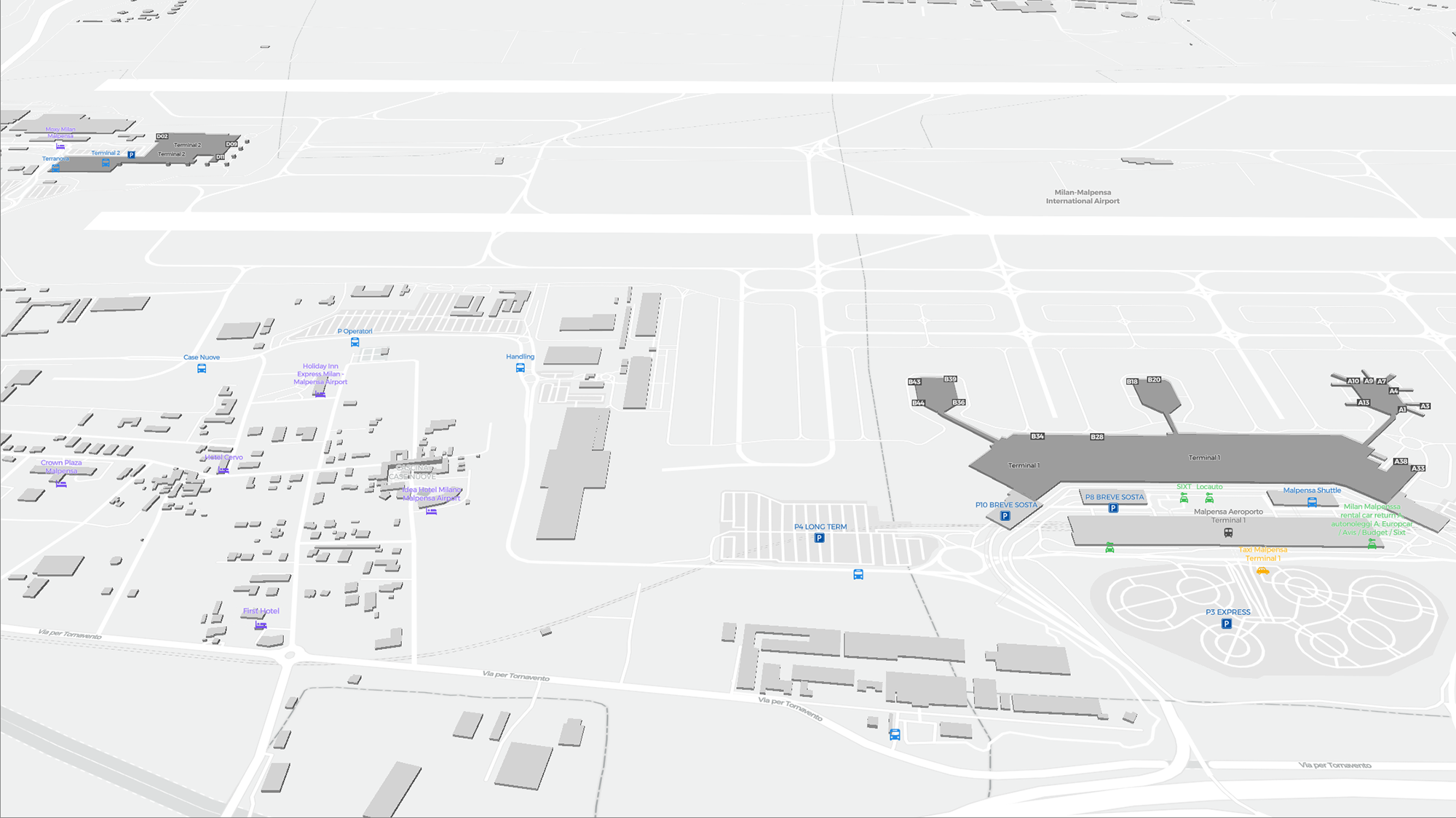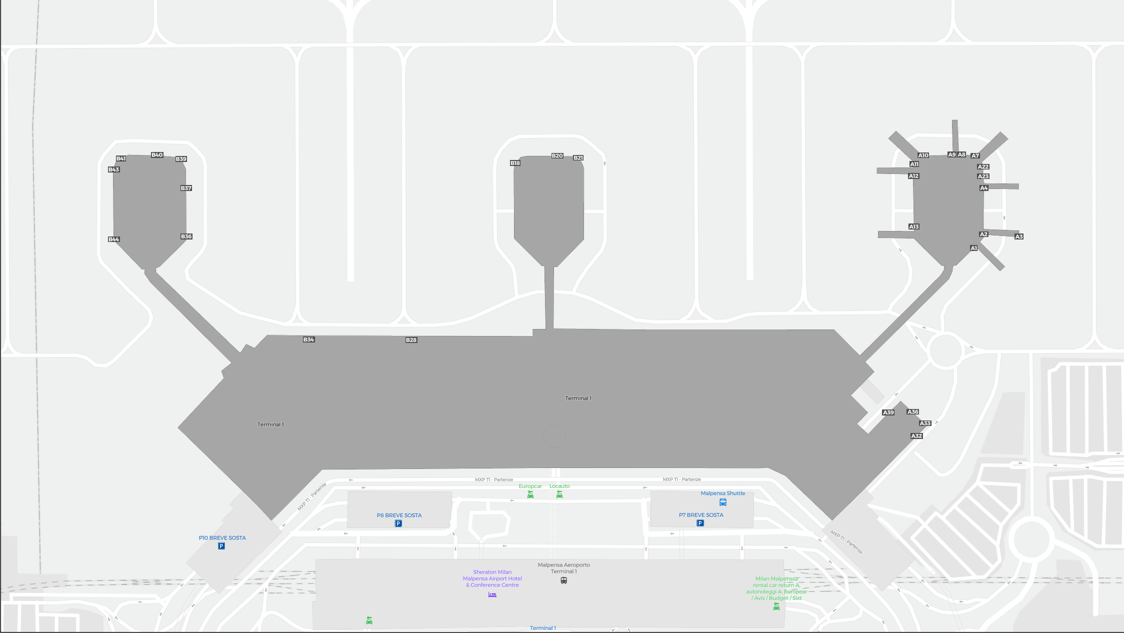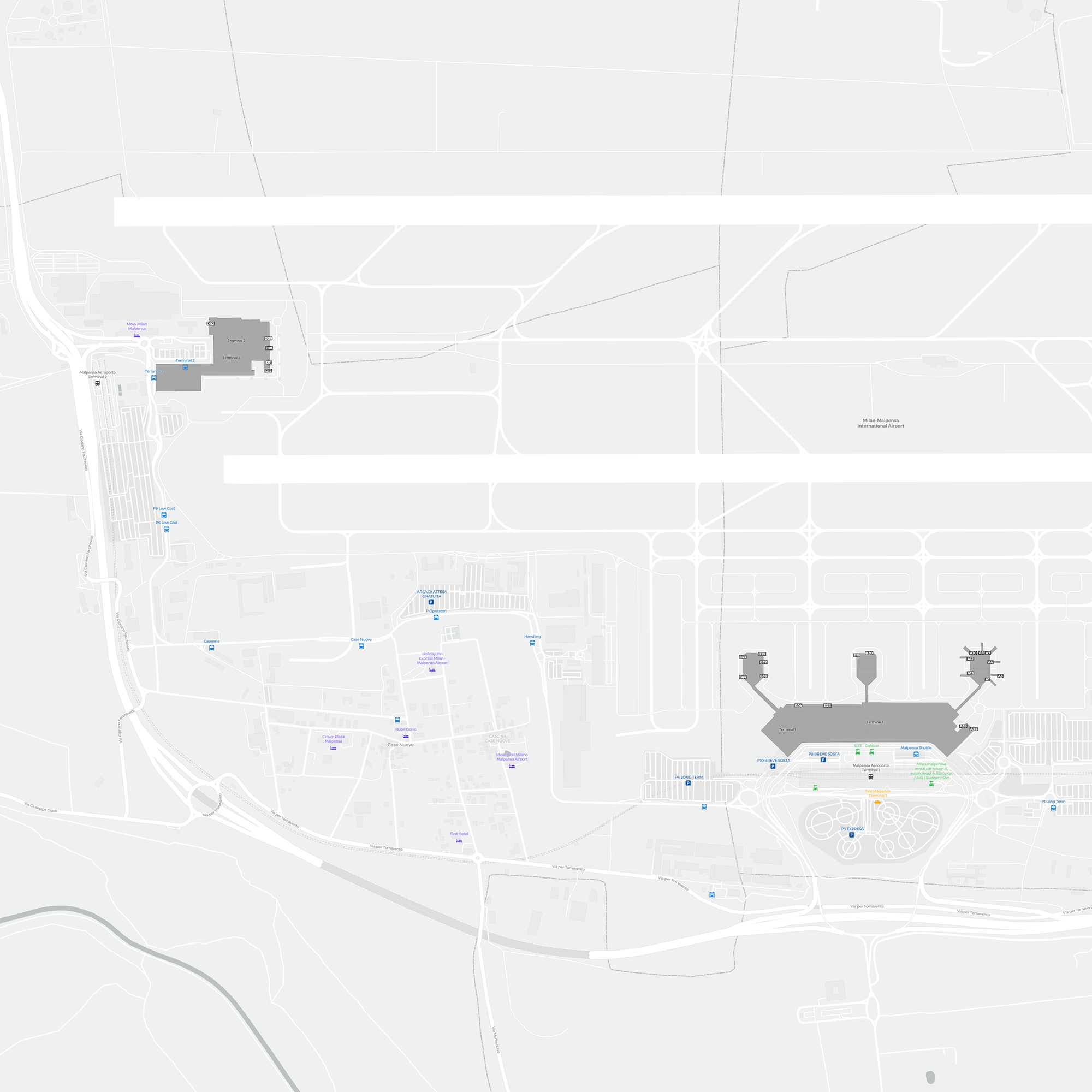 To jest powiększalna mapa nad Mediolan (MXP). Mapa pozwala zobaczyć teren z terminalami, parkingami, a na niektórych lotniskach także szczegóły dotyczące bramek, wypożyczalni samochodów i innych udogodnień przy powiększeniu.
