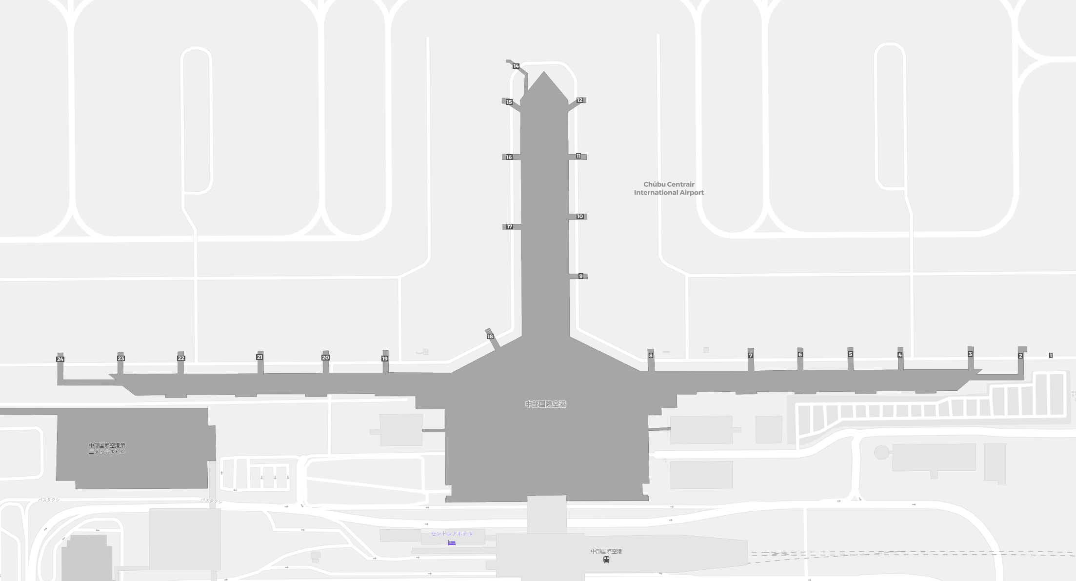 To jest powiększalna mapa nad Nagoja (NGO). Mapa pozwala zobaczyć teren z terminalami, parkingami, a na niektórych lotniskach także szczegóły dotyczące bramek, wypożyczalni samochodów i innych udogodnień przy powiększeniu.