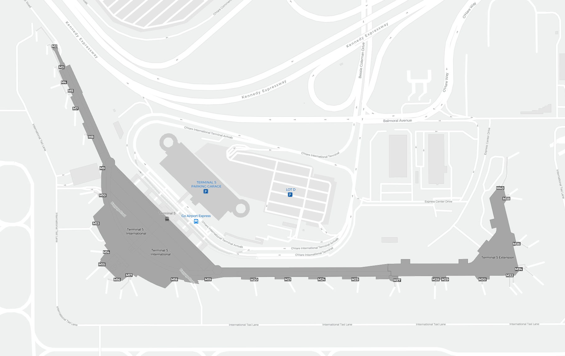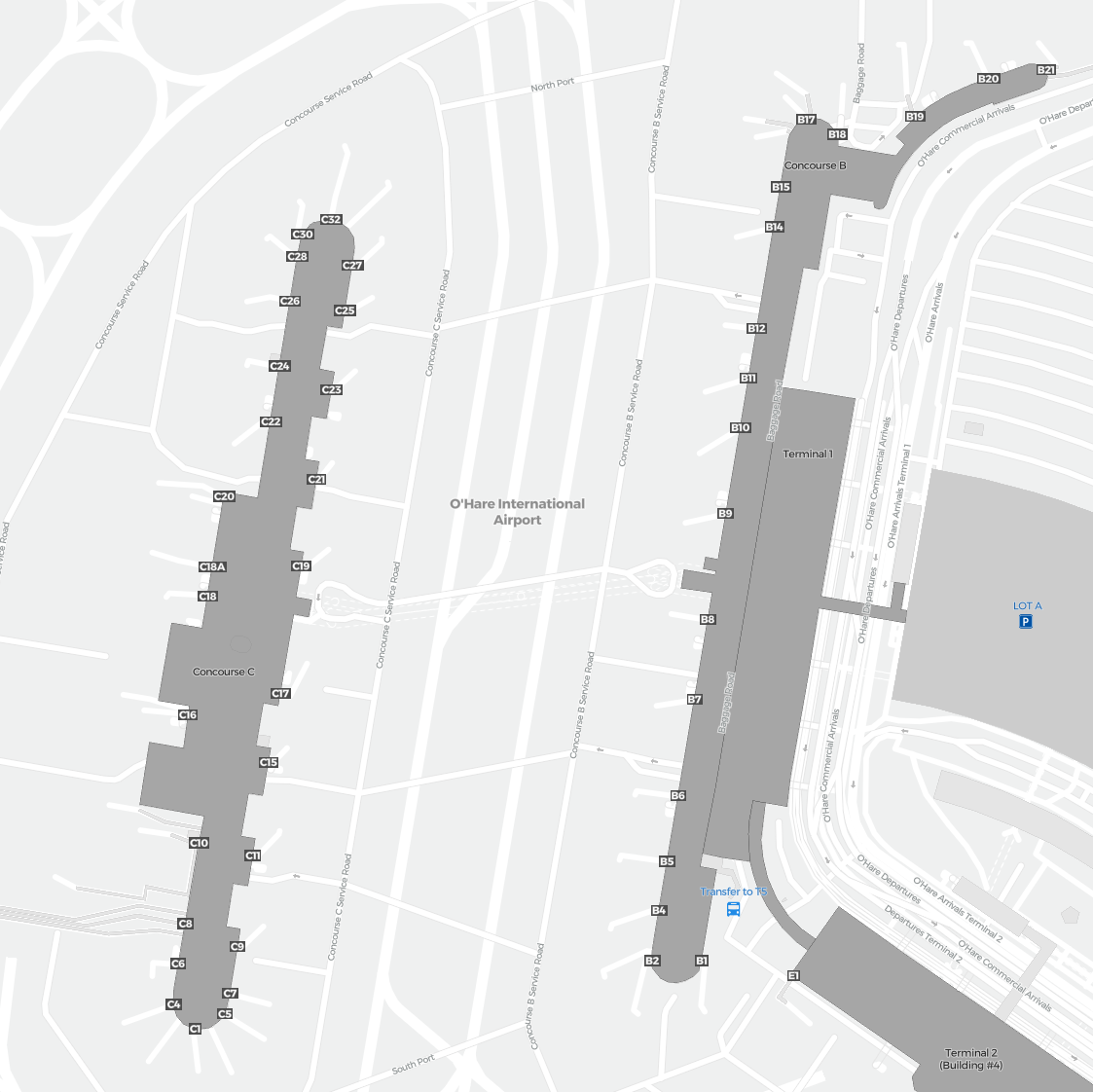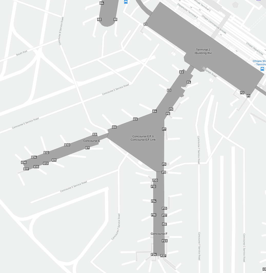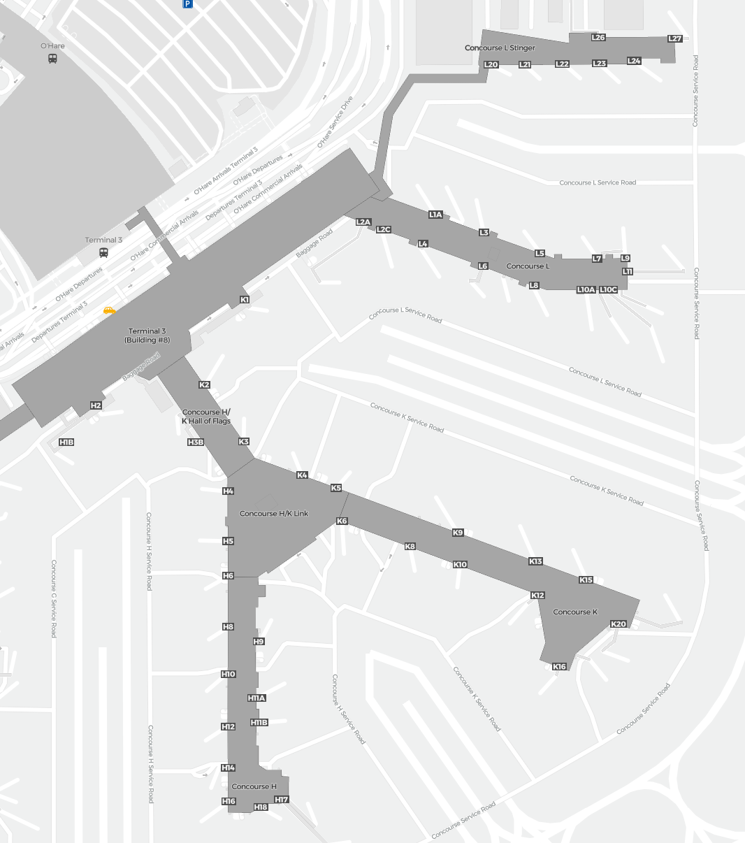 To jest powiększalna mapa nad Chicago (ORD). Mapa pozwala zobaczyć teren z terminalami, parkingami, a na niektórych lotniskach także szczegóły dotyczące bramek, wypożyczalni samochodów i innych udogodnień przy powiększeniu.