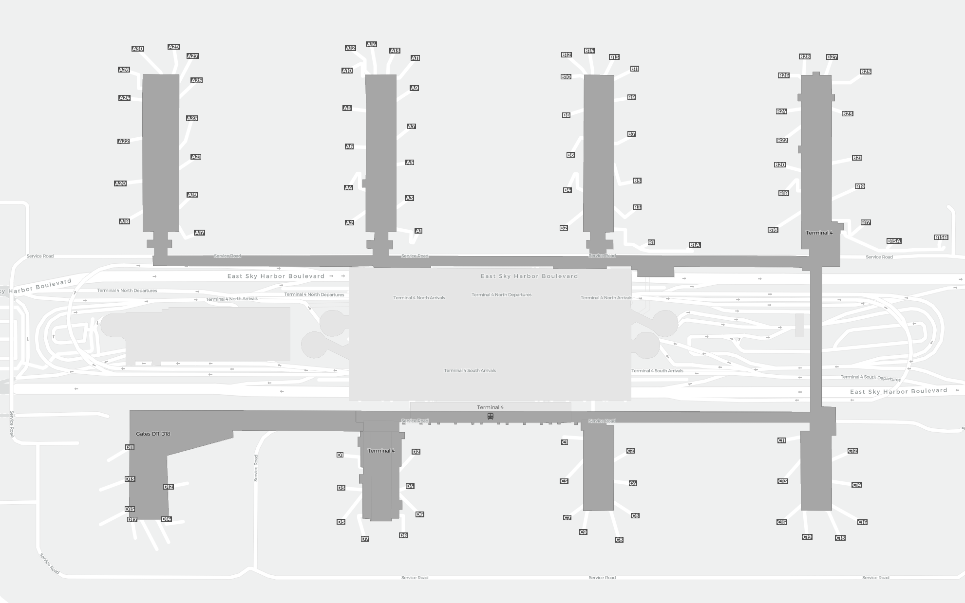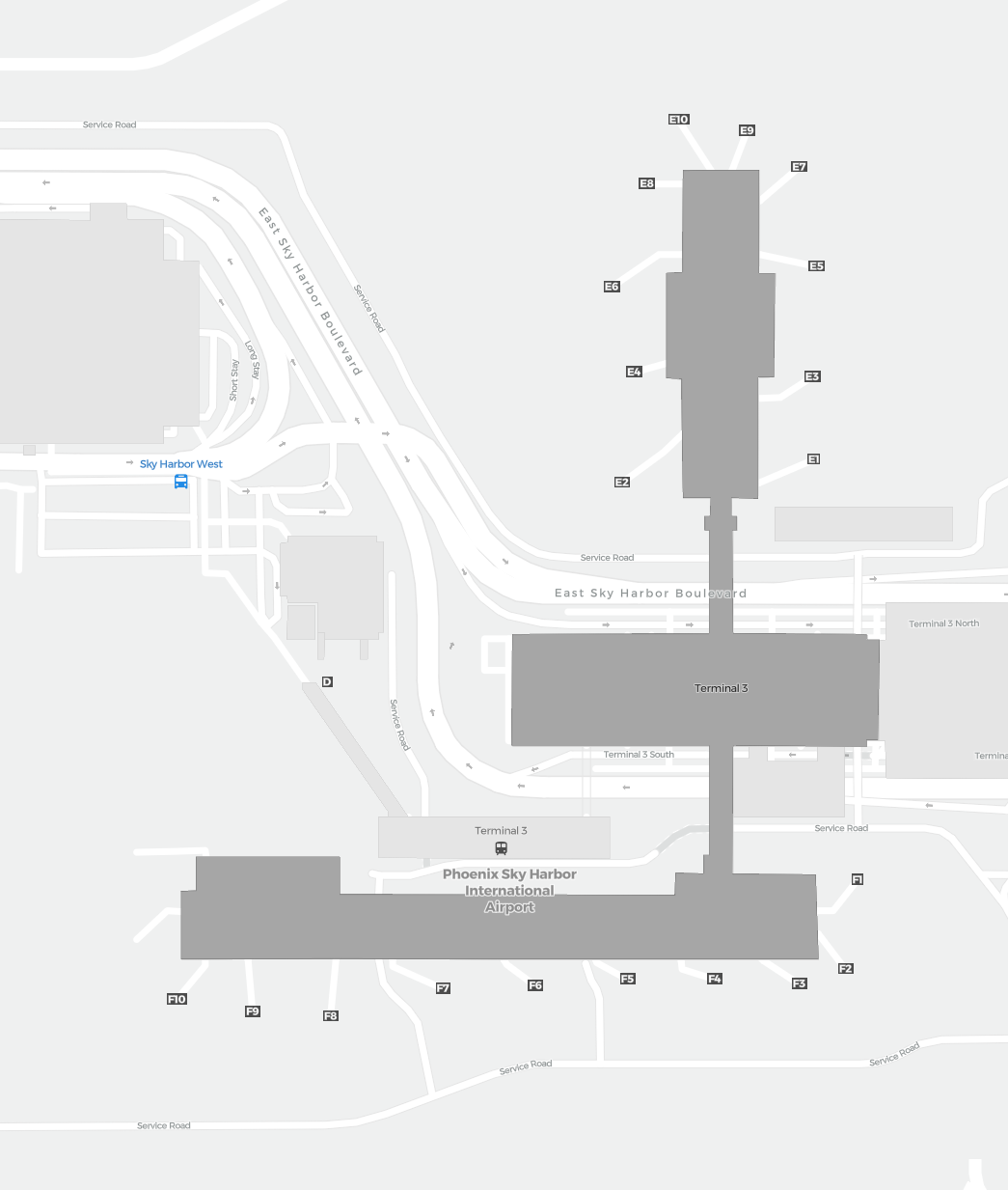 To jest powiększalna mapa nad Phoenix (PHX). Mapa pozwala zobaczyć teren z terminalami, parkingami, a na niektórych lotniskach także szczegóły dotyczące bramek, wypożyczalni samochodów i innych udogodnień przy powiększeniu.