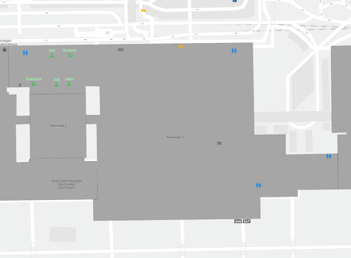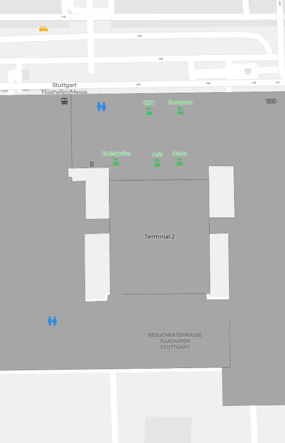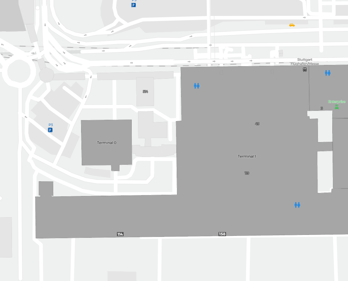 To jest powiększalna mapa nad Stuttgart (STR). Mapa pozwala zobaczyć teren z terminalami, parkingami, a na niektórych lotniskach także szczegóły dotyczące bramek, wypożyczalni samochodów i innych udogodnień przy powiększeniu.