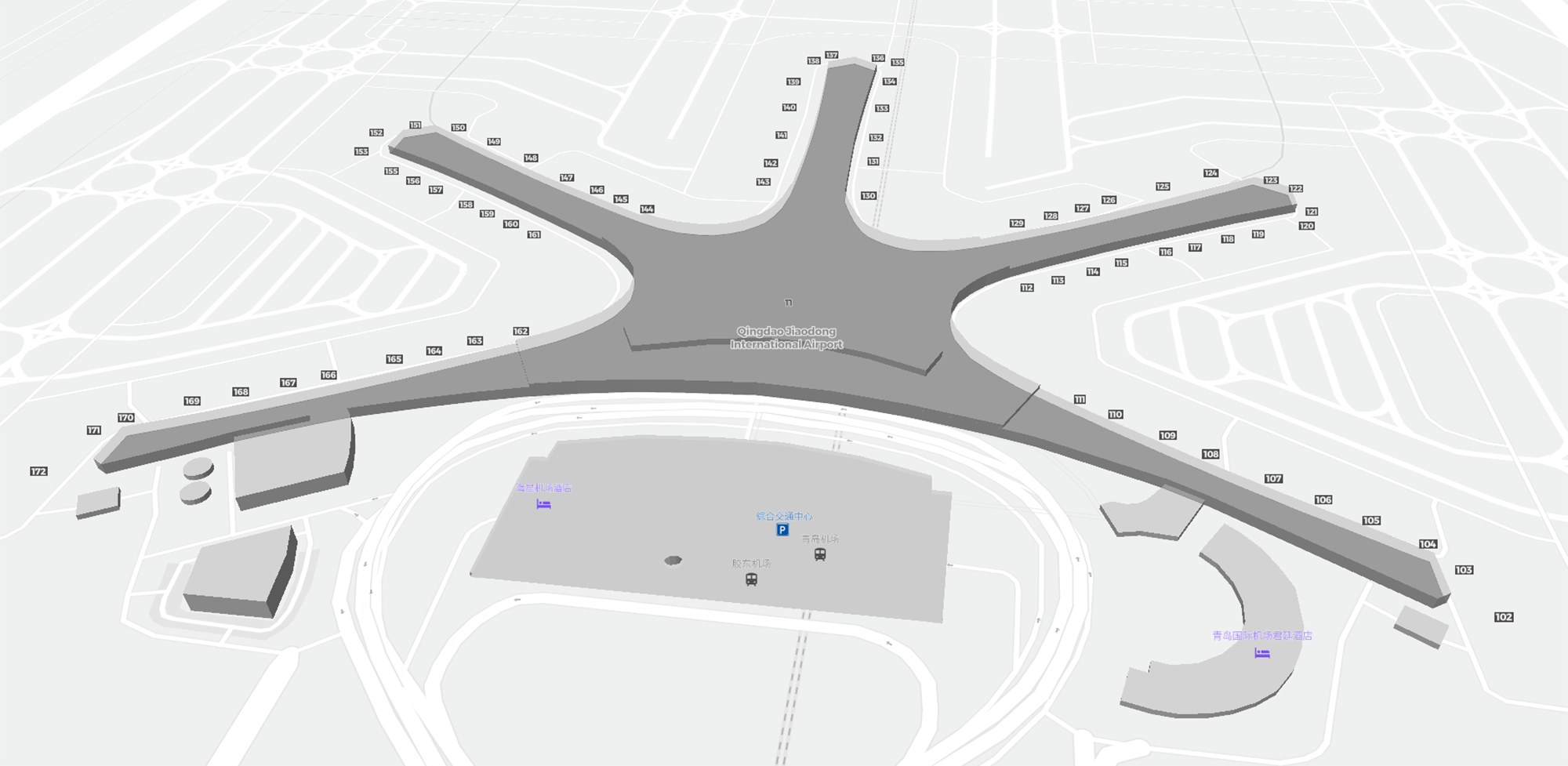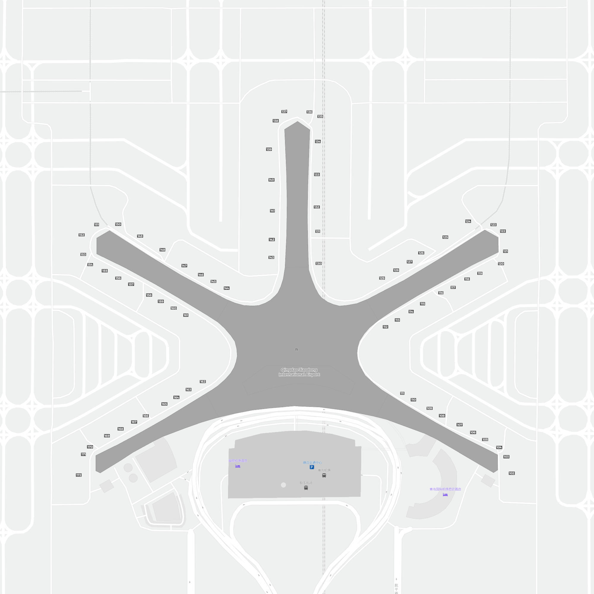 To jest powiększalna mapa nad Qingdao (TAO). Mapa pozwala zobaczyć teren z terminalami, parkingami, a na niektórych lotniskach także szczegóły dotyczące bramek, wypożyczalni samochodów i innych udogodnień przy powiększeniu.